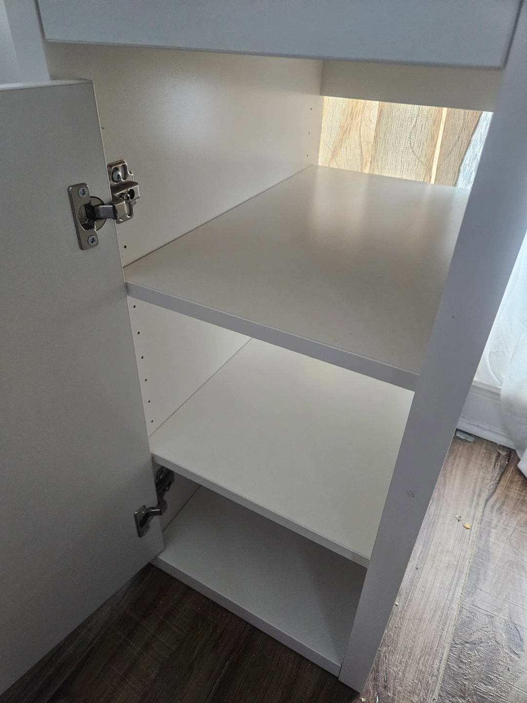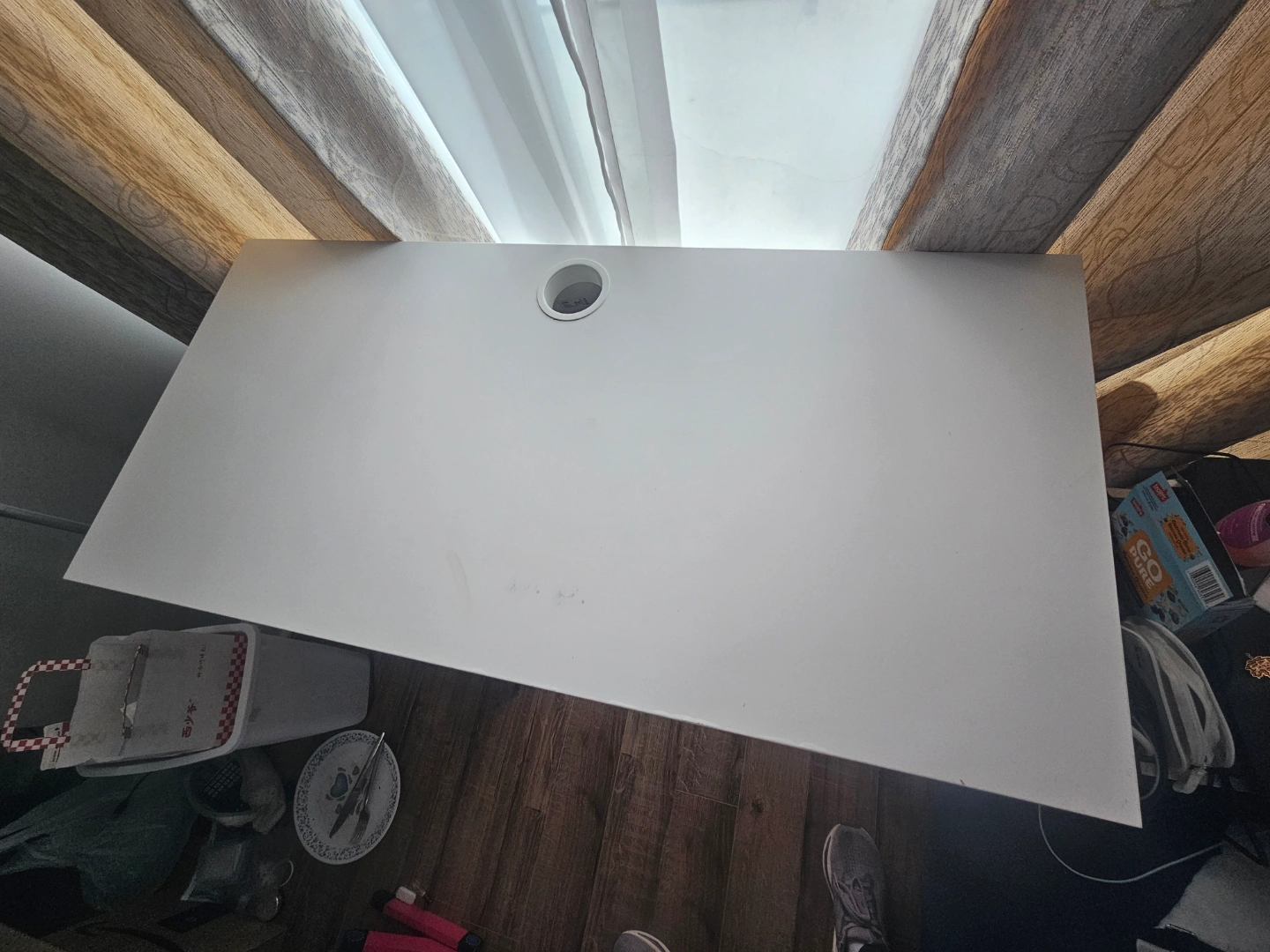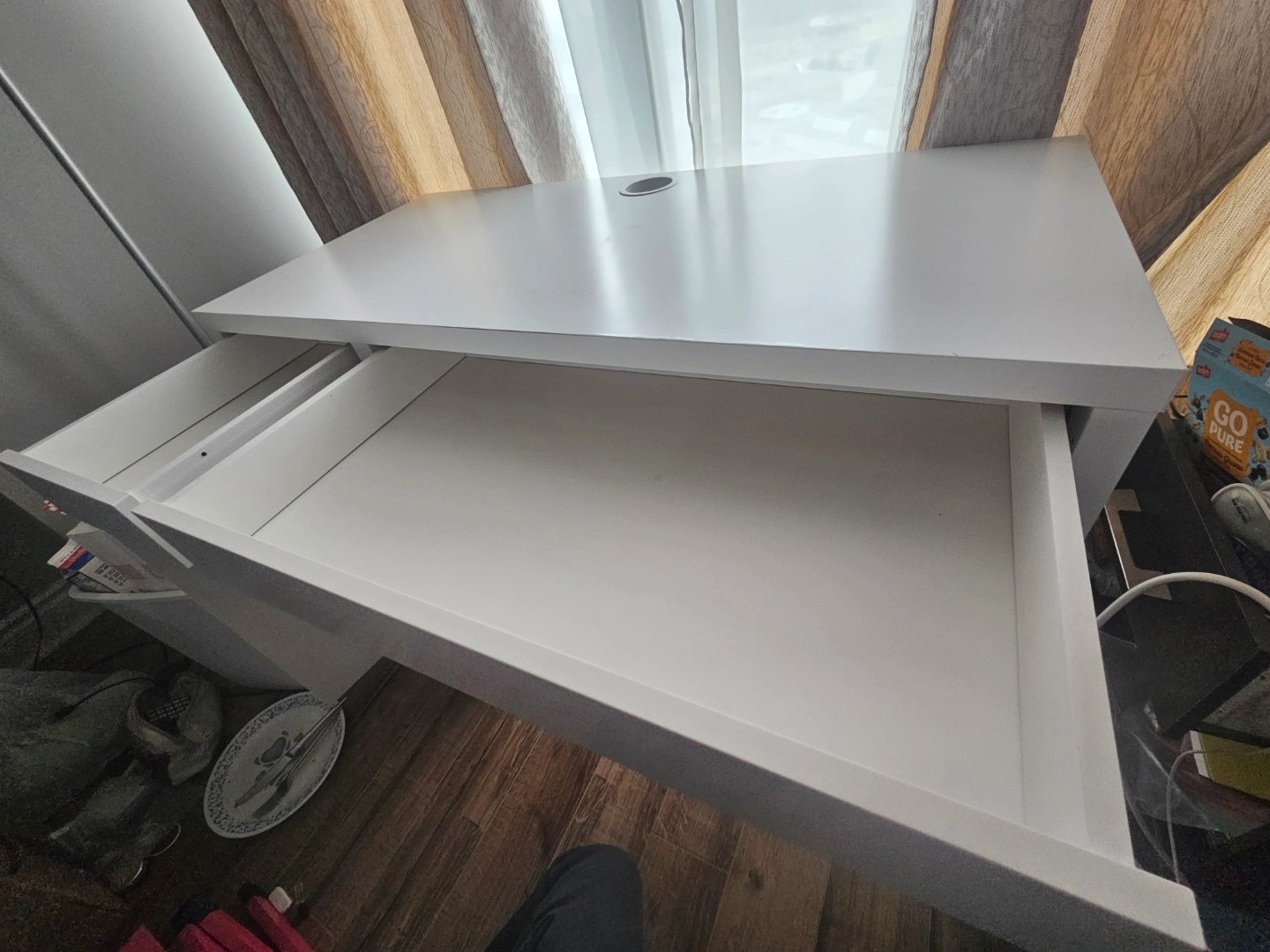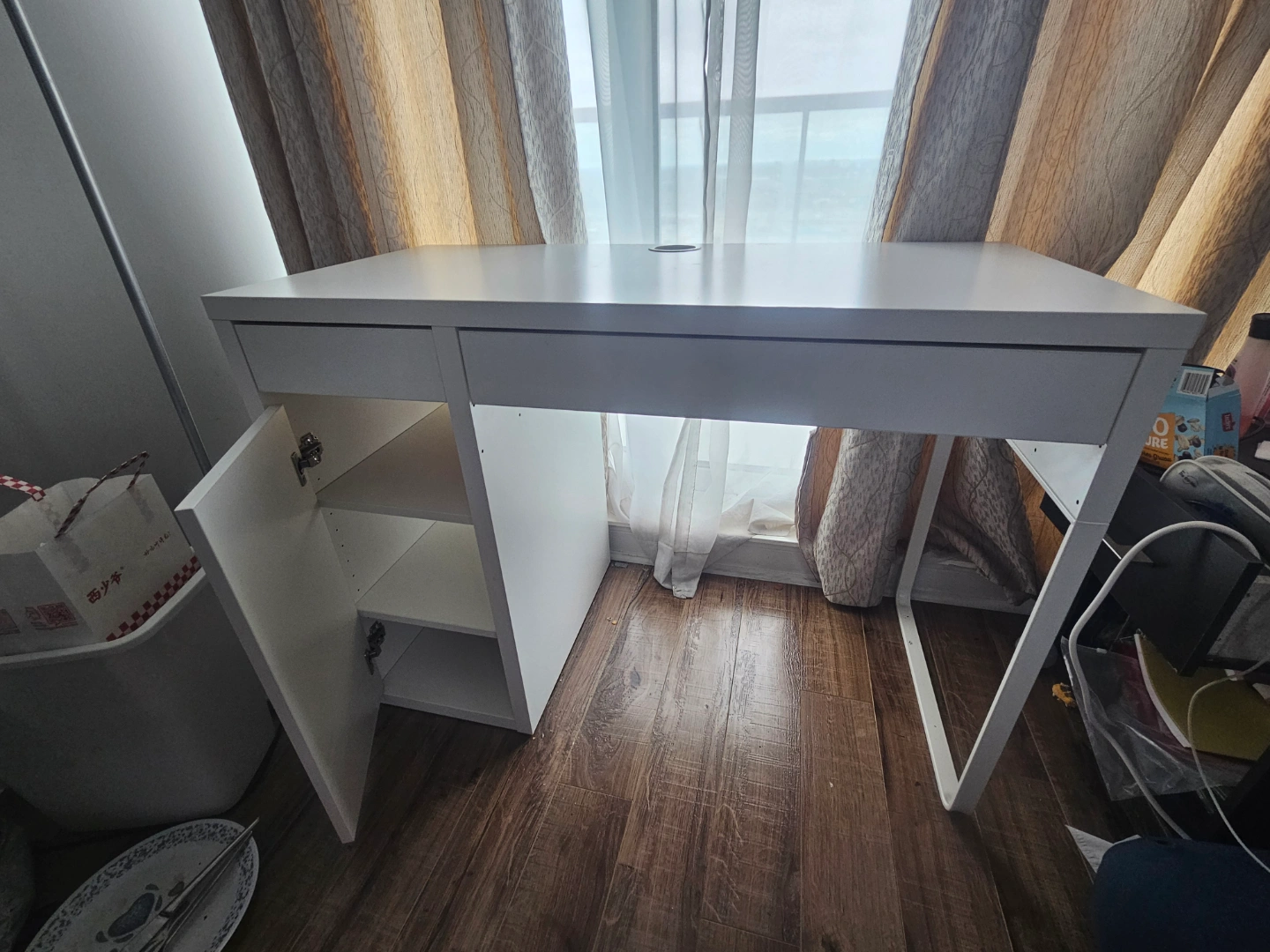 - White desk. Features one drawer and a small cabinet with two shelves. Cable hole in the desktop.