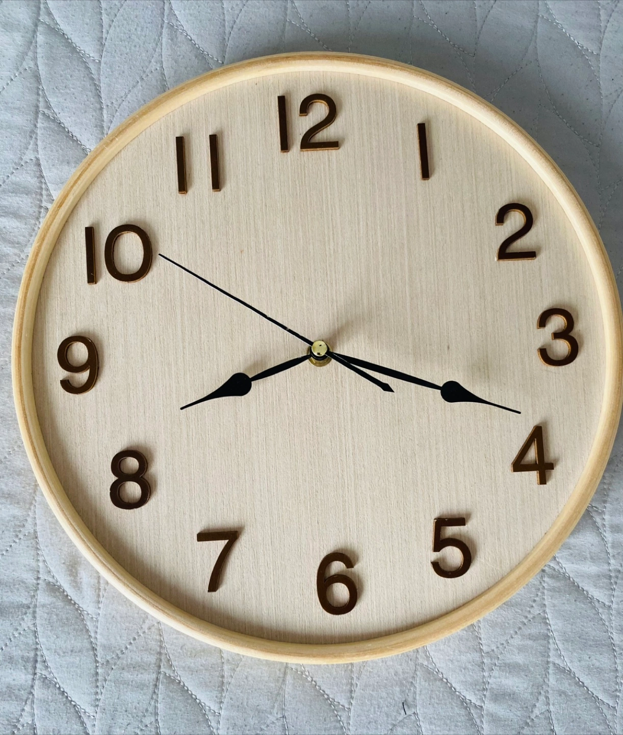Stylish minimalist wall clock. Features a light wood frame and gold numbers. Black hands and a simple design.