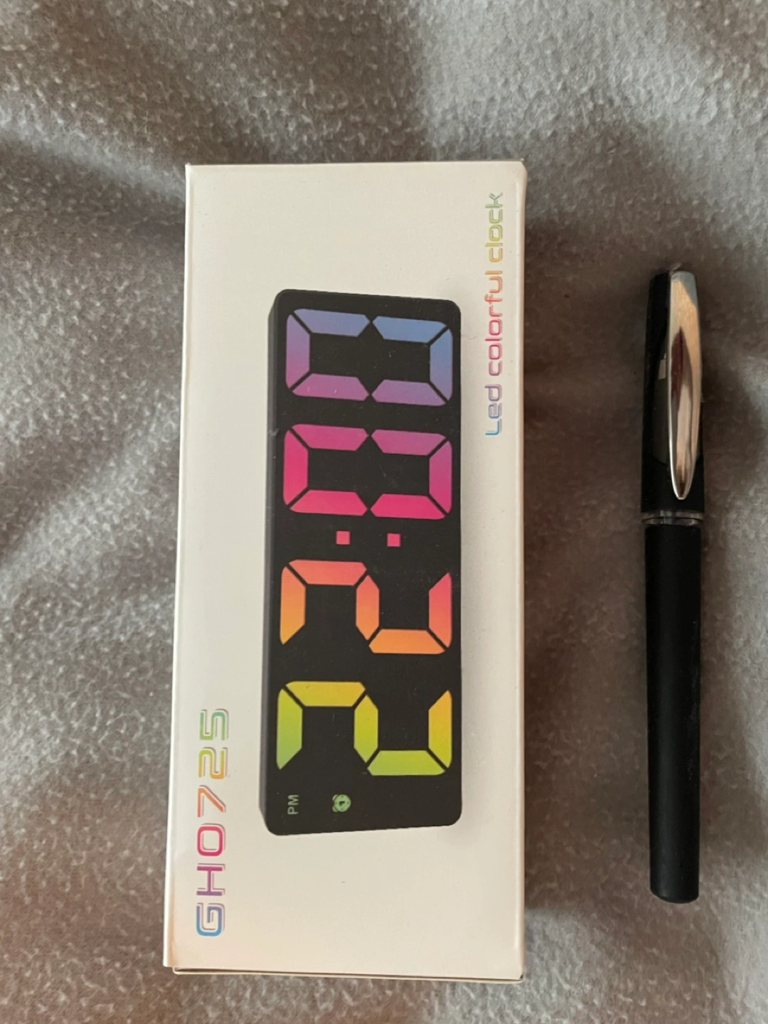 Modern LED digital clock. Colourful display. USB powered. Compact size. Includes USB charging cable. Great for bedside table or desk. Never used. Instructions included.