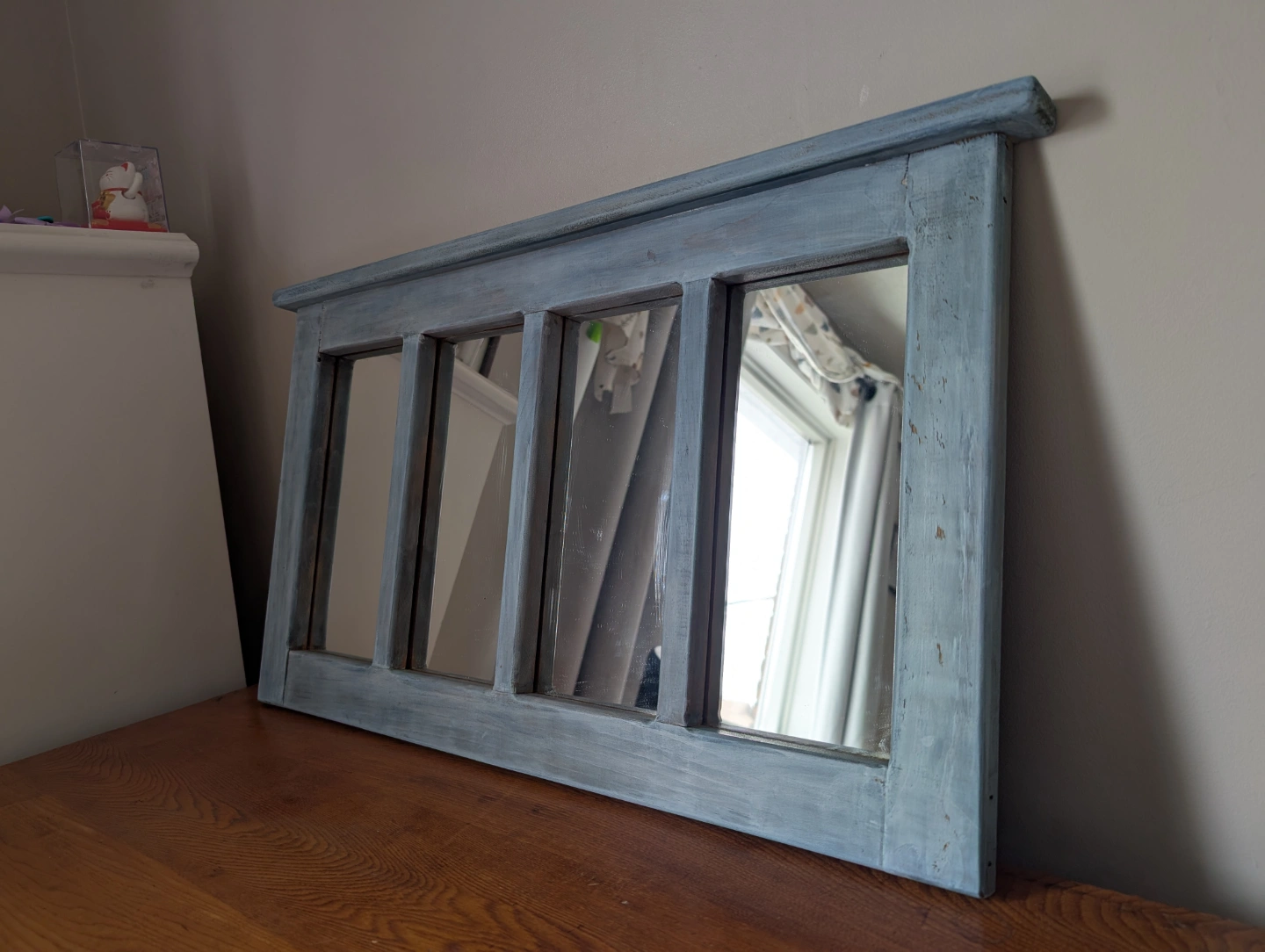 Beachy blue wooden framed mirror. Four panels. 16 inches tall 27 inches along the bottom 29 inches along the top Has two hangers on the back for mounting, one at each top corner. Pick up central Barrie. Could maybe deliver within Barrie
