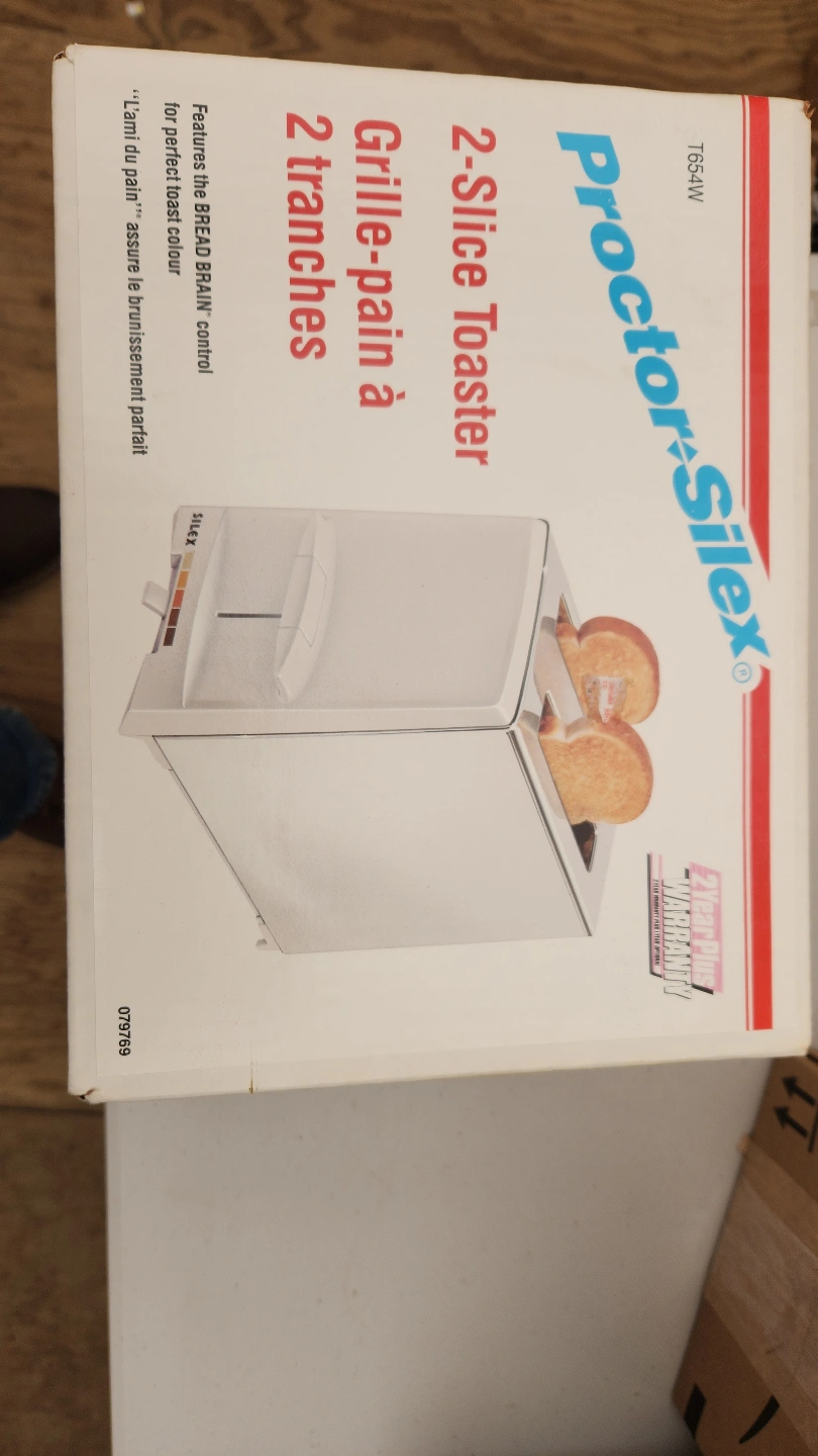 Vintage Proctor Silex 2-slice toaster. New, still in original box. Features a bread and moisture sensor for perfect toasting. Chrome finish with white end panels. Easy cleaning.