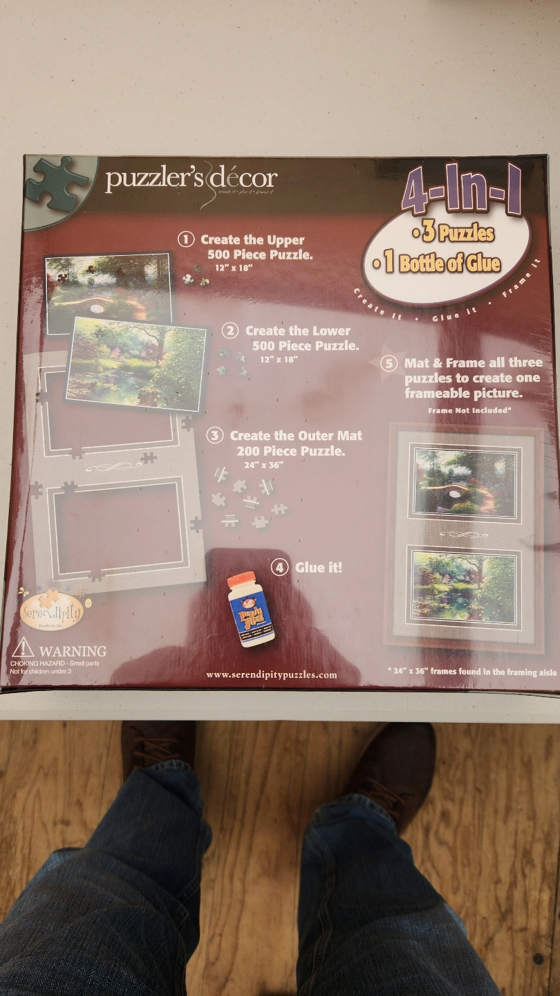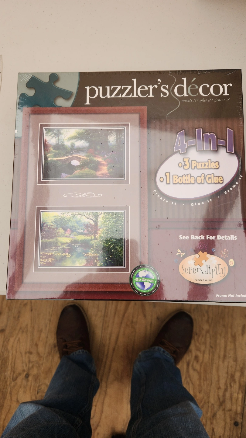 New, sealed 4-in-1 puzzle. Includes three puzzles. Create a larger image from smaller ones. Frame not included. Do not know if glue is good or not.