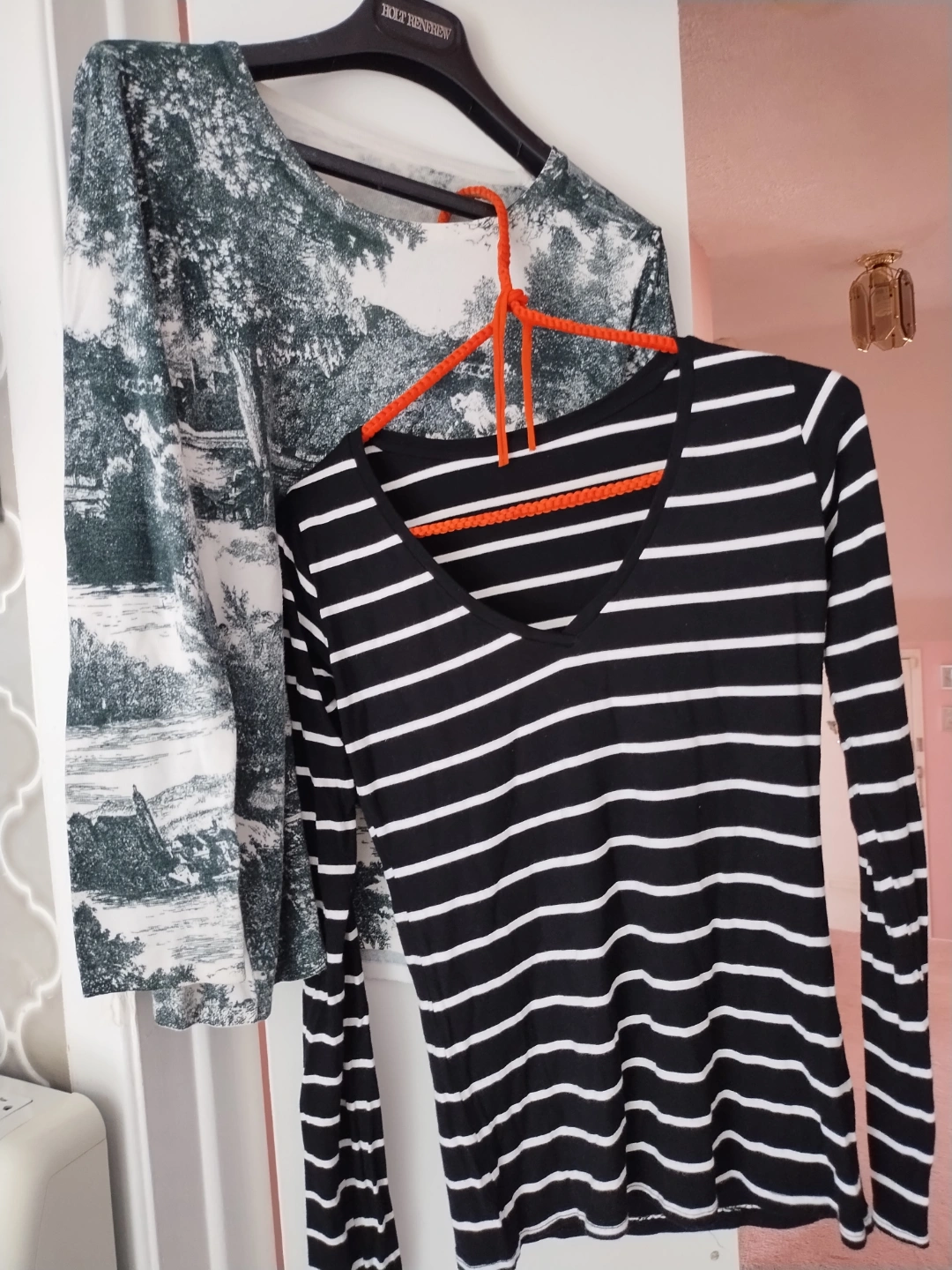 Bundle of two long-sleeved tops. One features a nature-inspired print, the other has black and white stripes. Both are in good used condition. Ideal for layering or everyday wear.