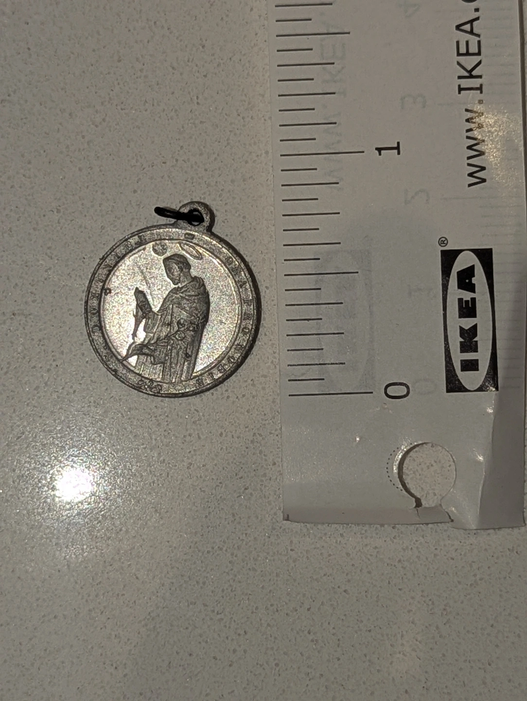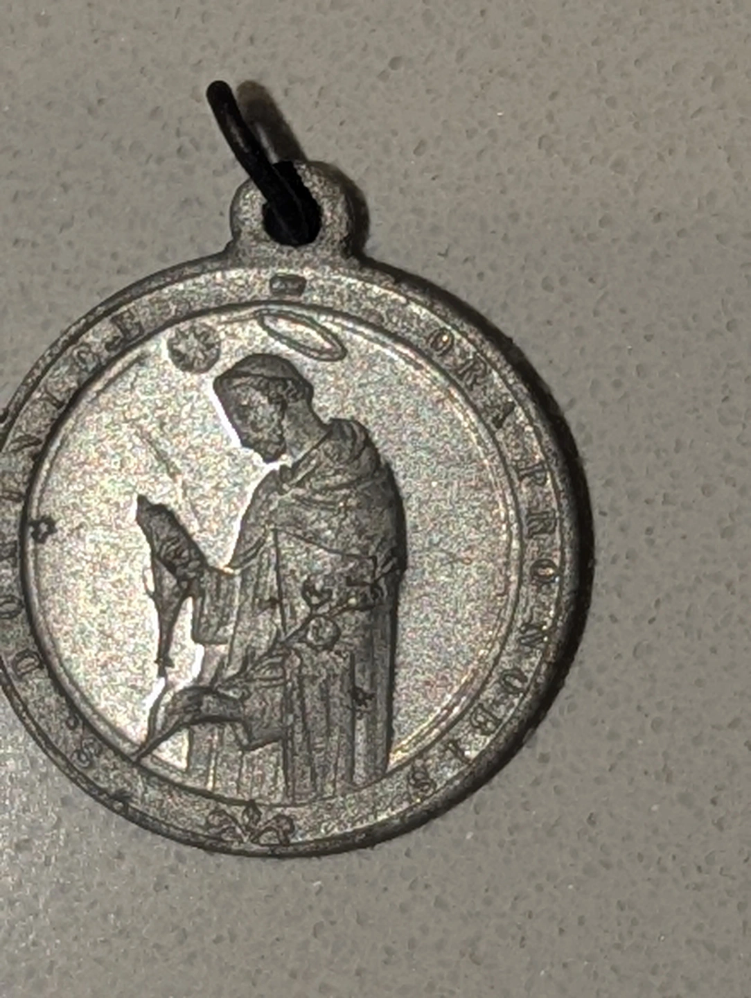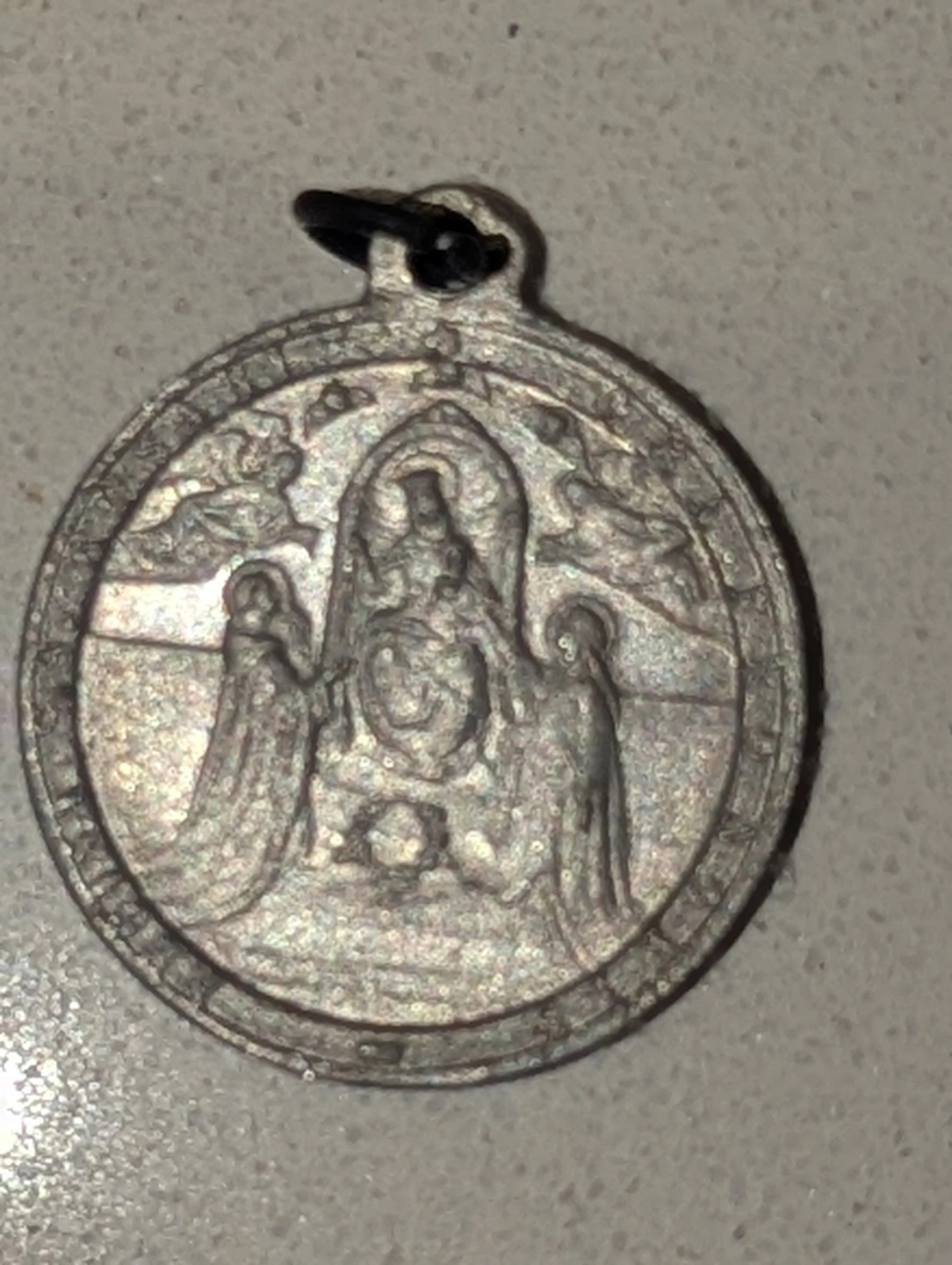 1934 vintage religious medal pendants. Silver-toned metal. Each features a different religious image. Small size. Black cord.