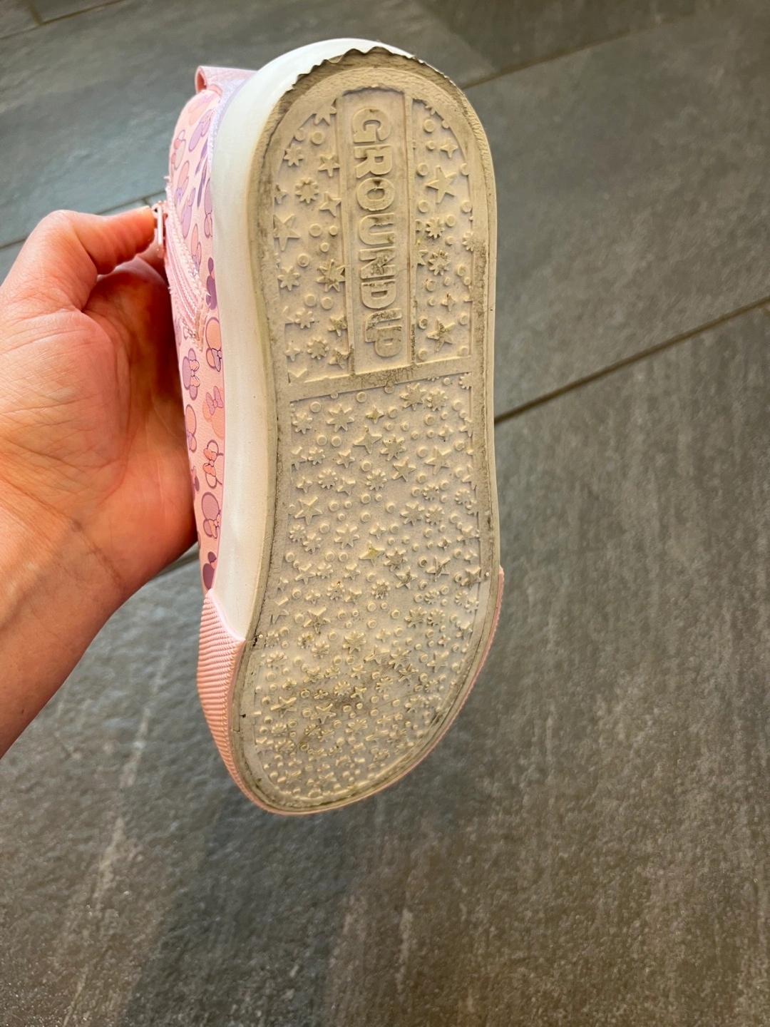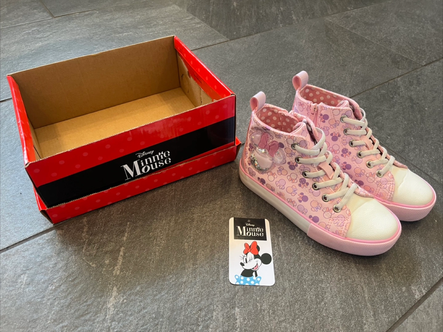 Adorable Minnie Mouse high-top sneakers. Pink and purple design. Features a side zipper and lace-up closure. Comes in original box. Worn once. Kids size 1. Pickup only, near Oakland’s elementary