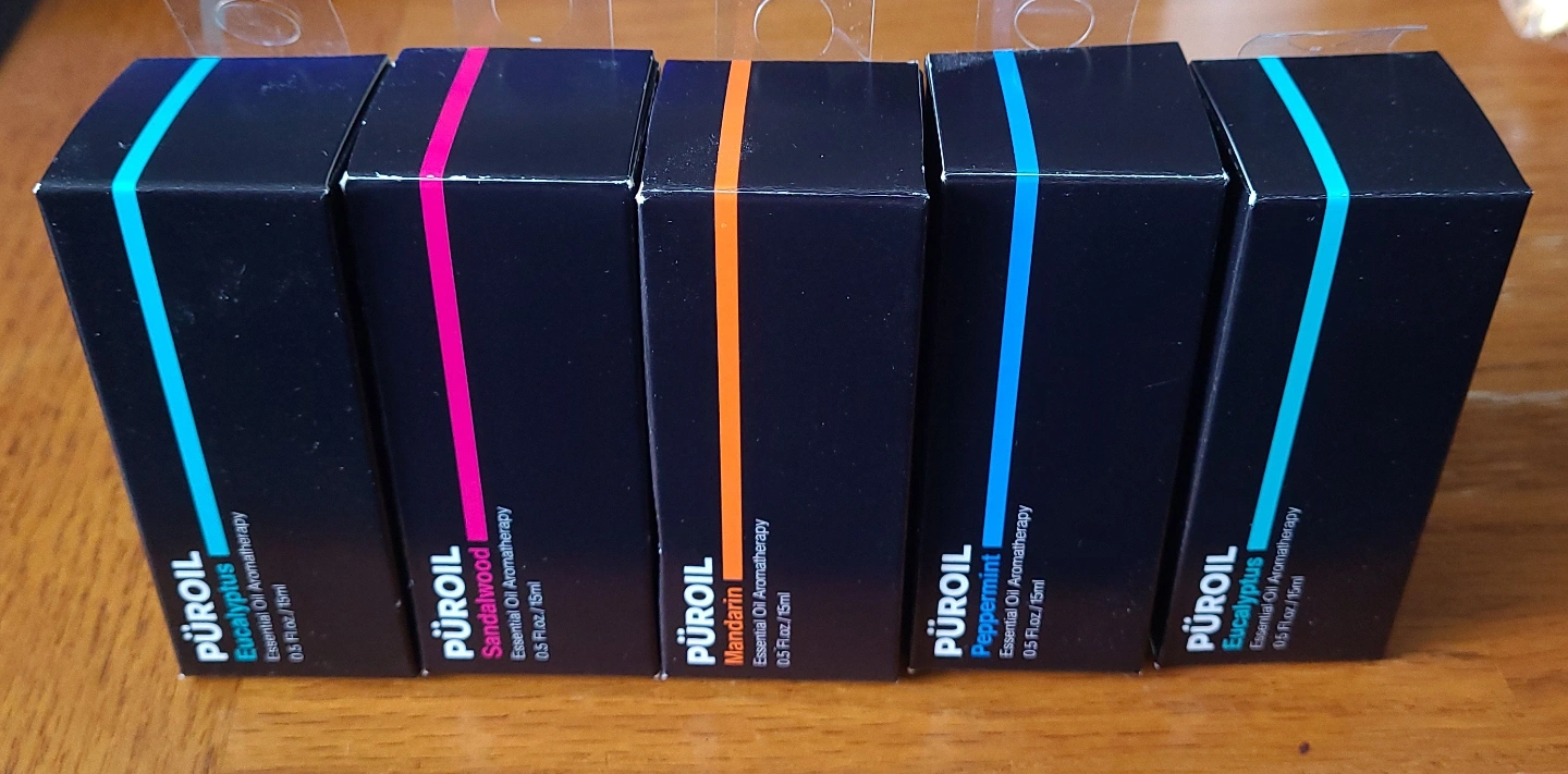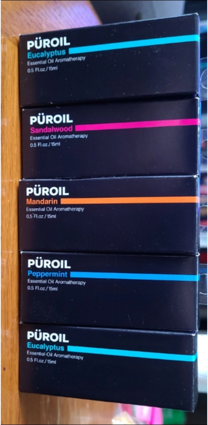 Total of five 0.5 fl oz / 15ml PÜROIL essential oil aromatherapy bottles. Scents include Eucalyptus x2 Sandalwood, Mandarin, Peppermint. Brand new in box.