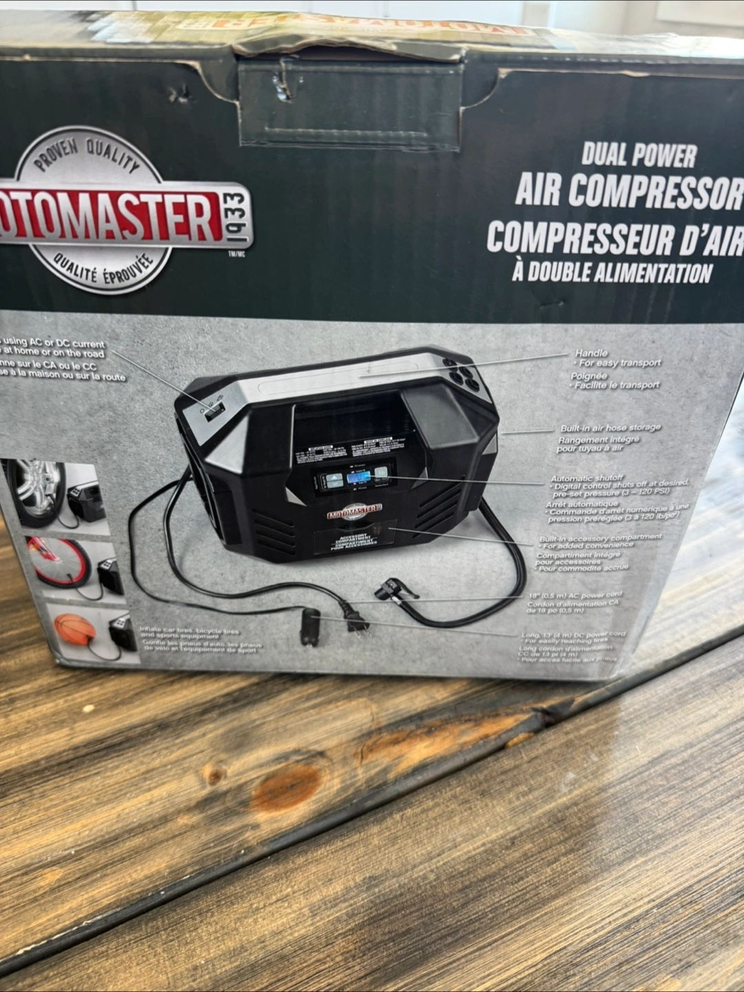 Portable air compressor. Inflates car tires, bicycles, and sports equipment. Uses AC or DC current. Features built-in air hose storage and accessory compartment. Digital control with automatic shutoff.
