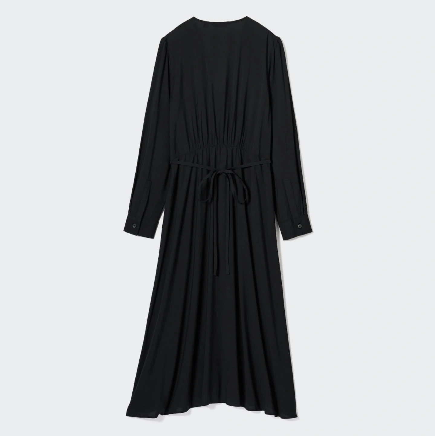 Elegant black midi dress. Features long sleeves, button-down front, cinched waist, and self-tie belt. Perfect for any occasion.