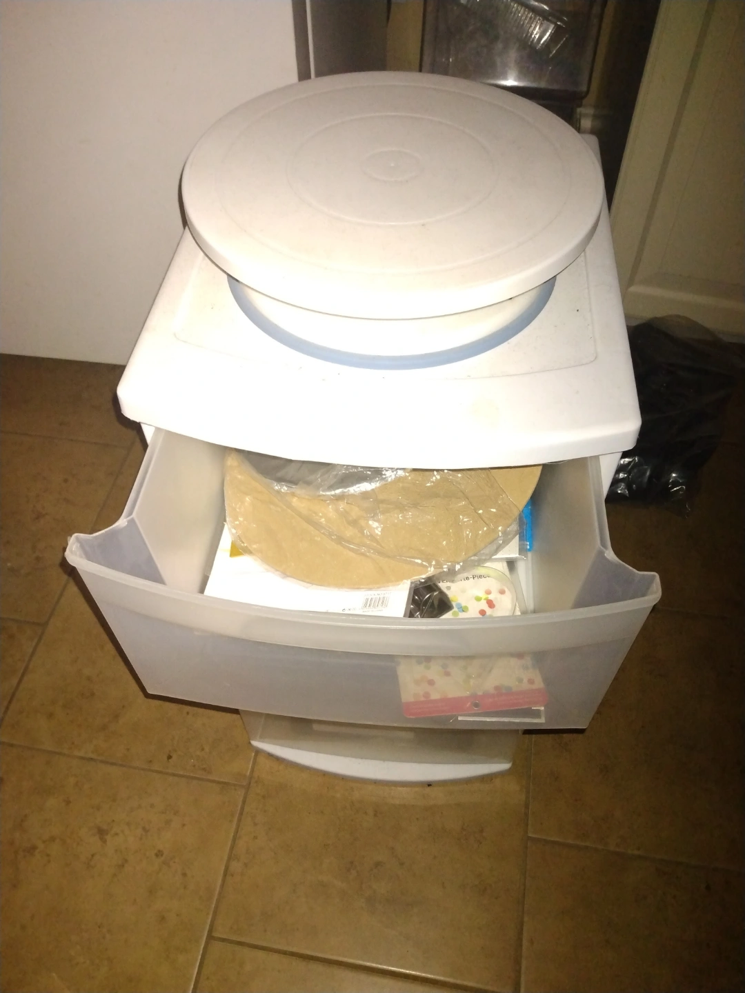 Three-tiered plastic drawer unit. Rotating cake stand. Various cake decorating tools and supplies. Set of 18 steak knives. Ideal for bakers and cake decorators.