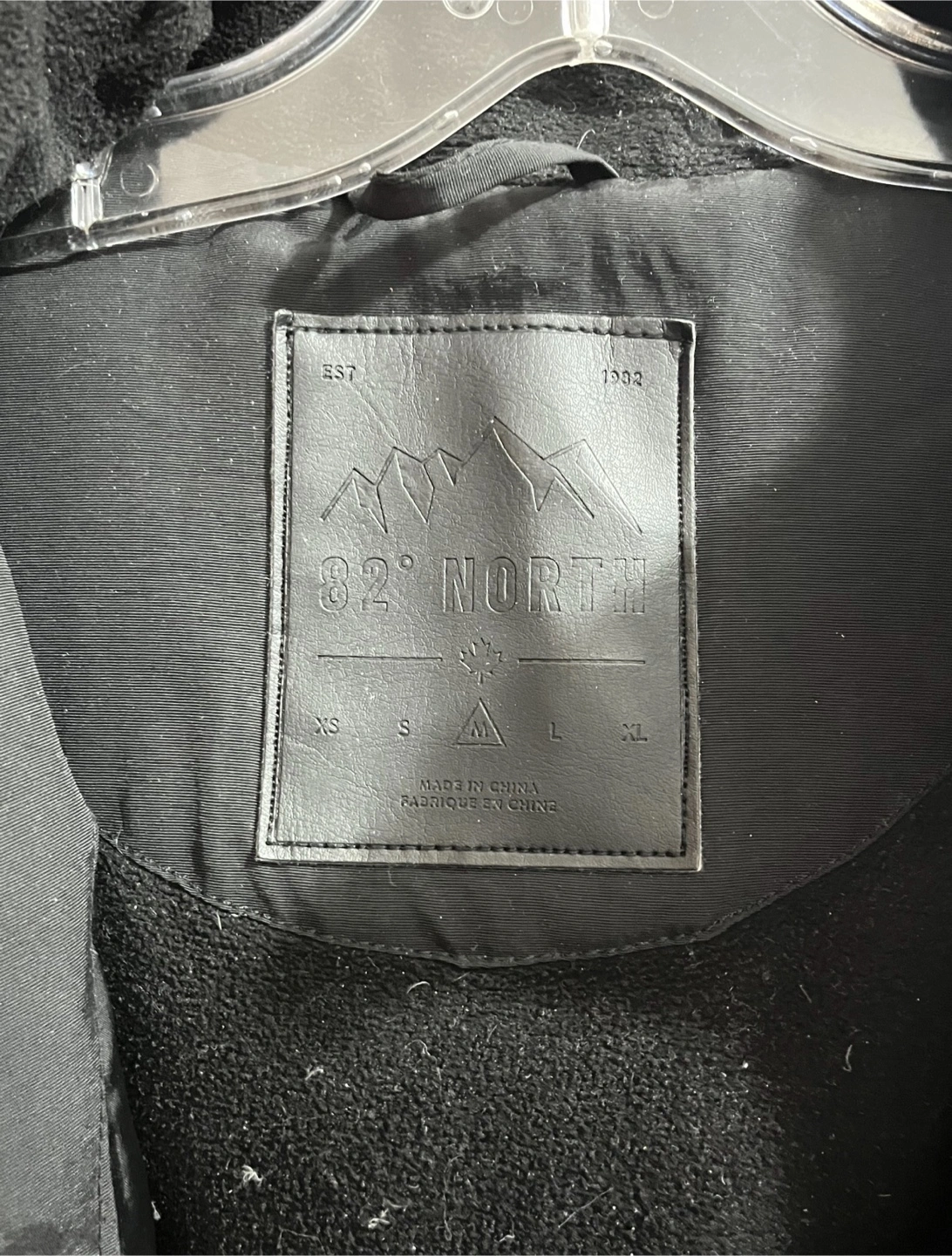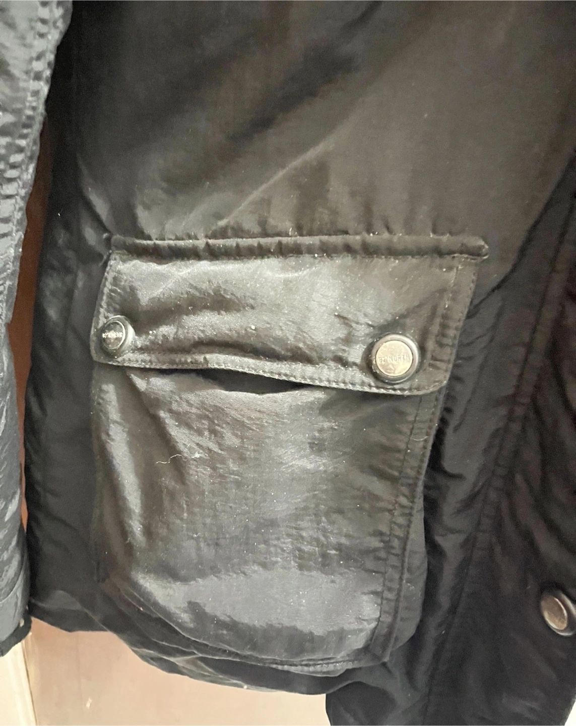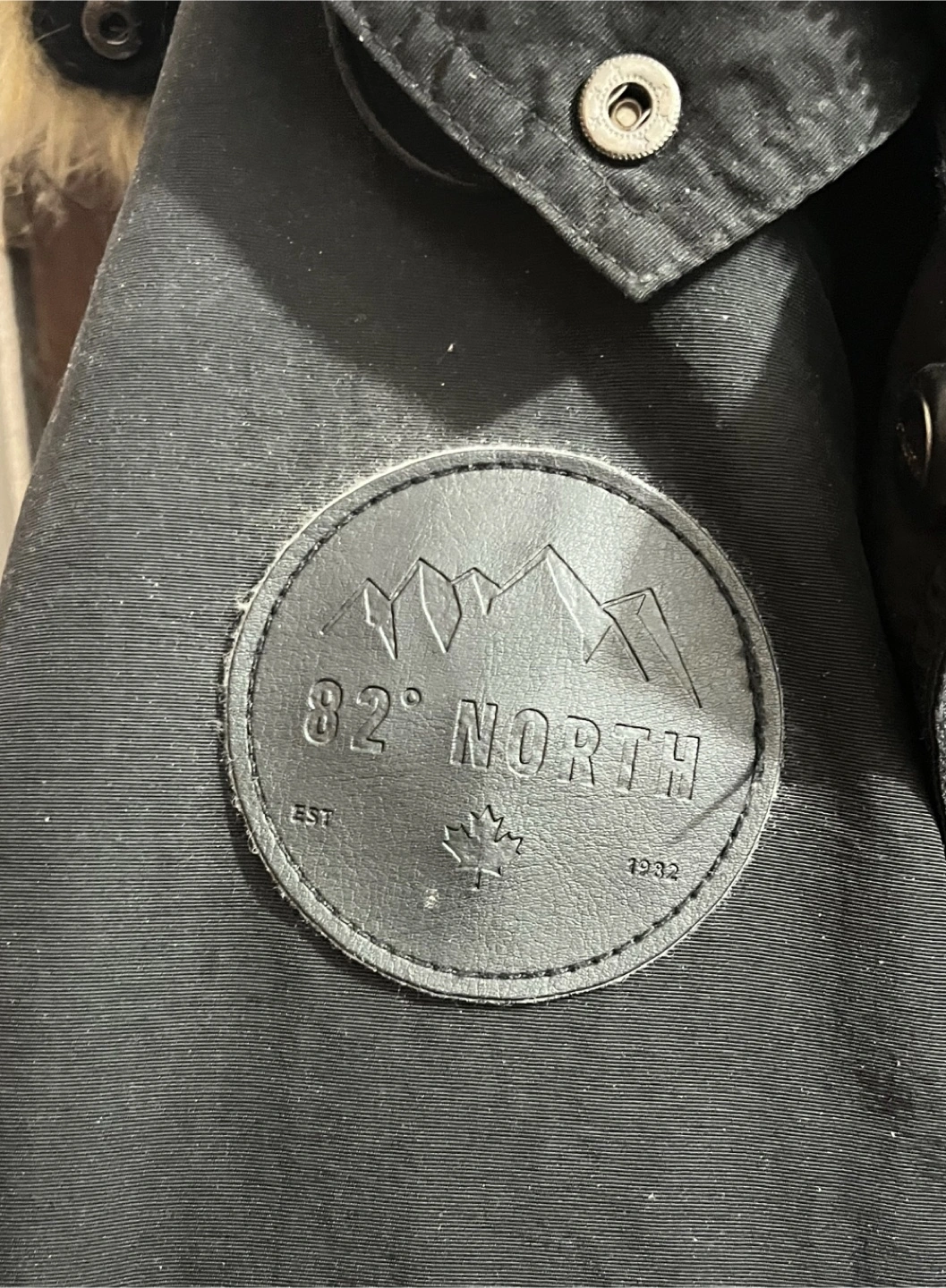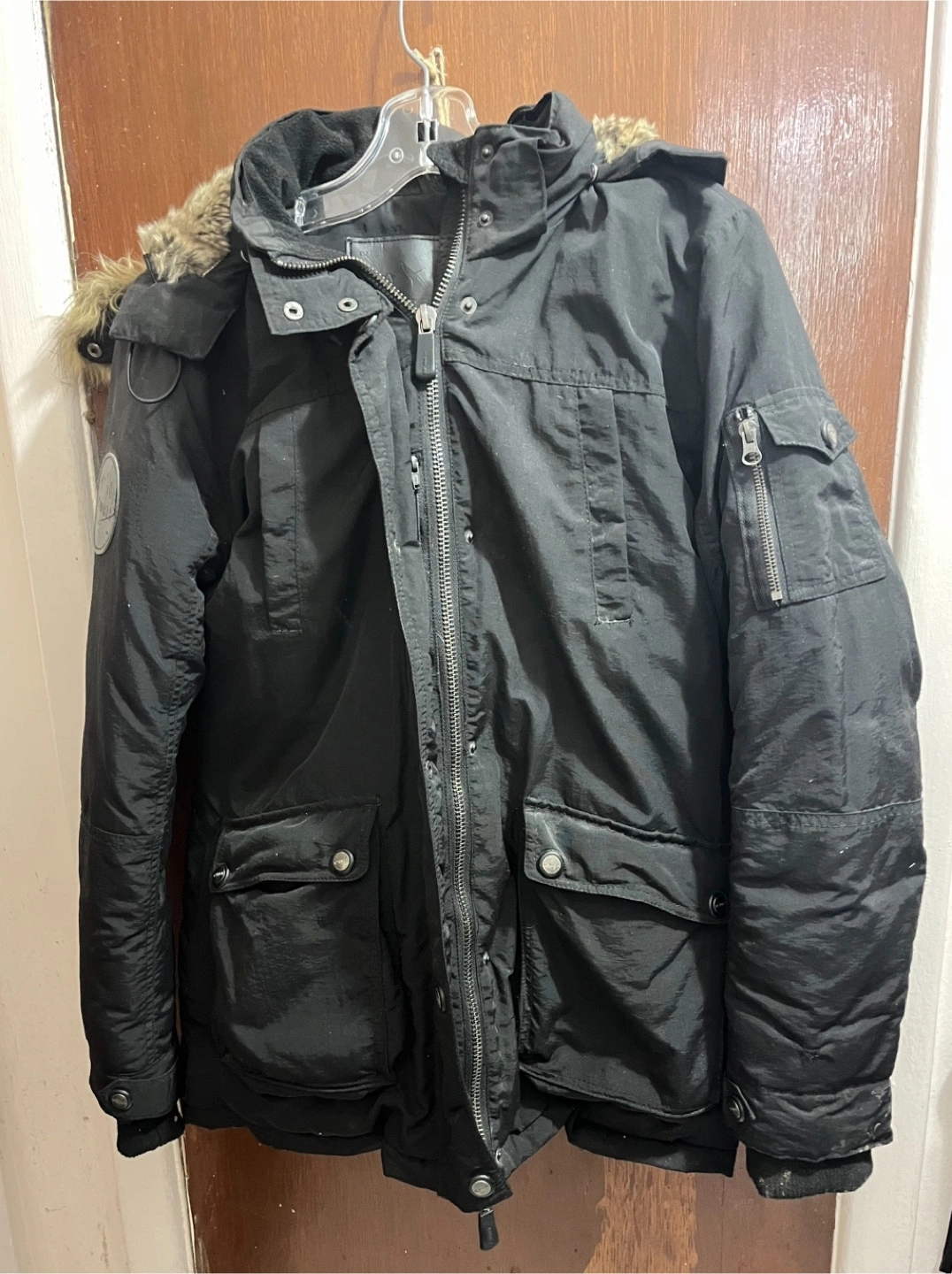 Warm winter parka. Black colour. Features a faux fur-trimmed hood, zip-up front, multiple pockets, and long sleeves. Good for cold weather.