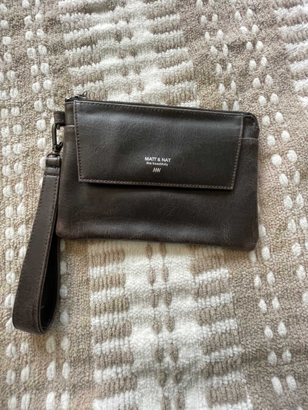 Brand New Matt & Nat Wristlet – Deep Brown Never been used! This sleek Matt & Nat wristlet is perfect for when you want to travel light but stay stylish. • Rich deep brown color • Lots of cardholder slots inside • Snap-button storage pocket on the outside for easy access • Vegan leather (Matt & Nat style, you know!)
