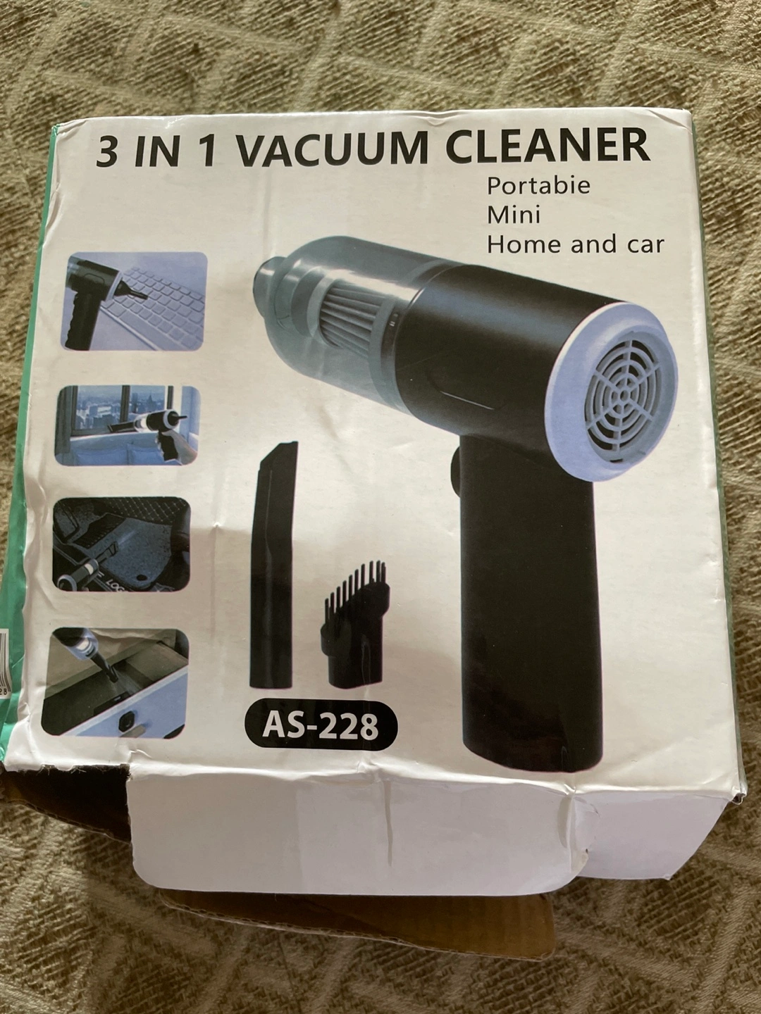 Portable mini vacuum cleaner. Great for home and car use. Includes various attachments. Model number AS-228.