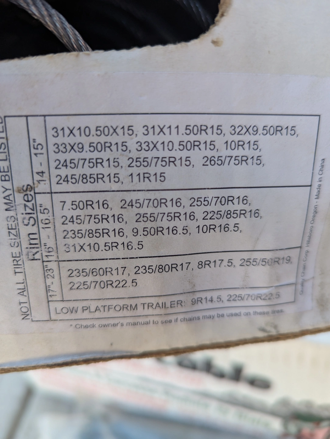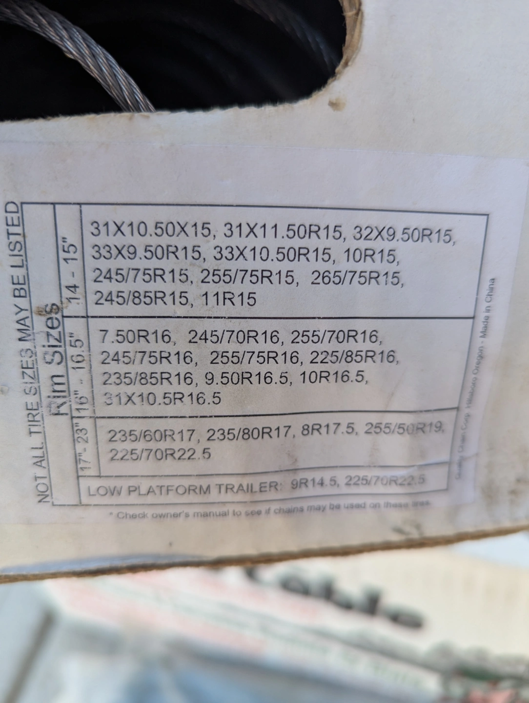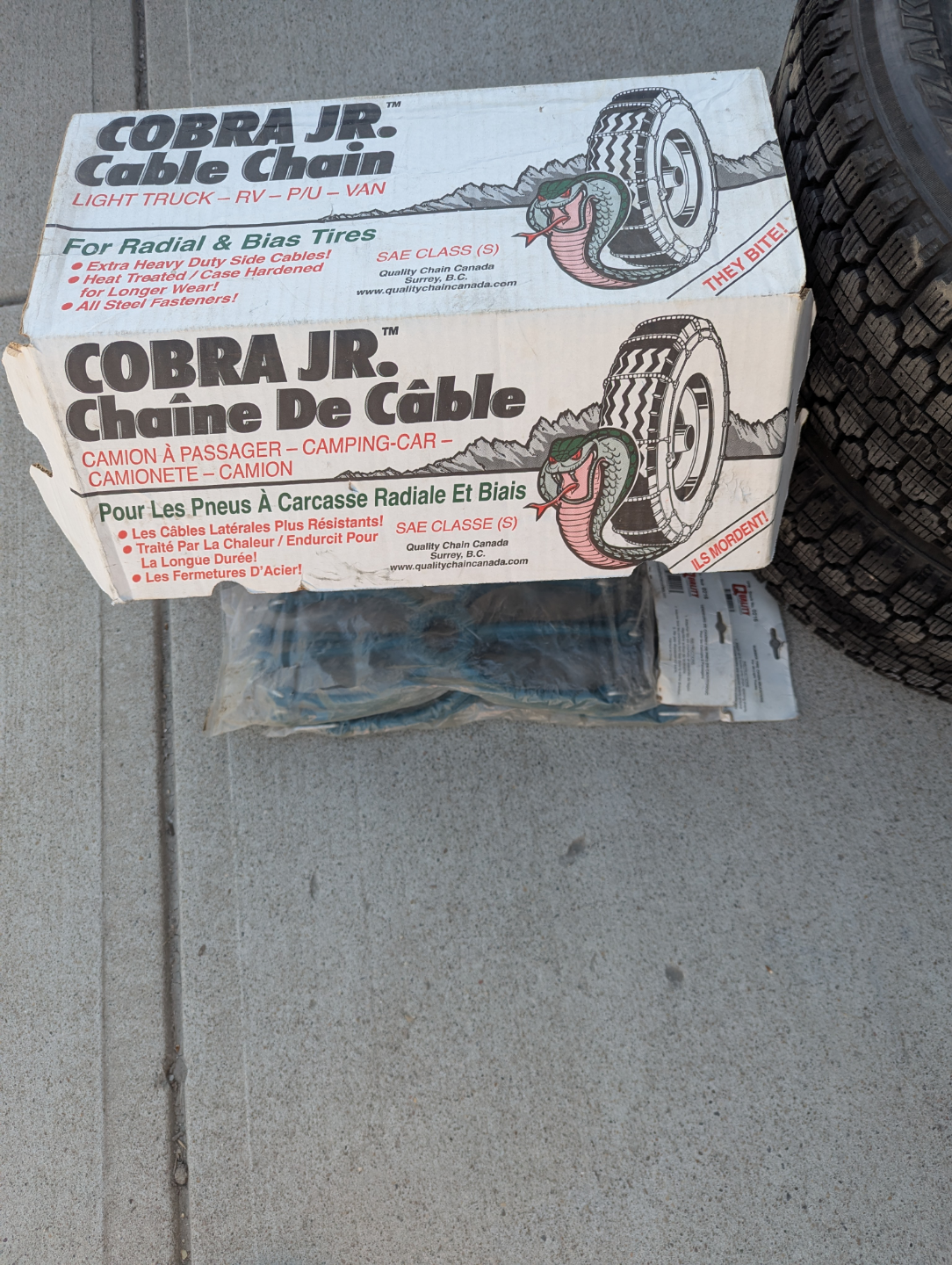 New in box. Cable chains for radial and bias tires. SAE Class S. Fits various rim sizes. Check the box for specifics.