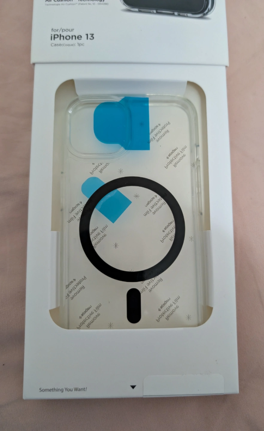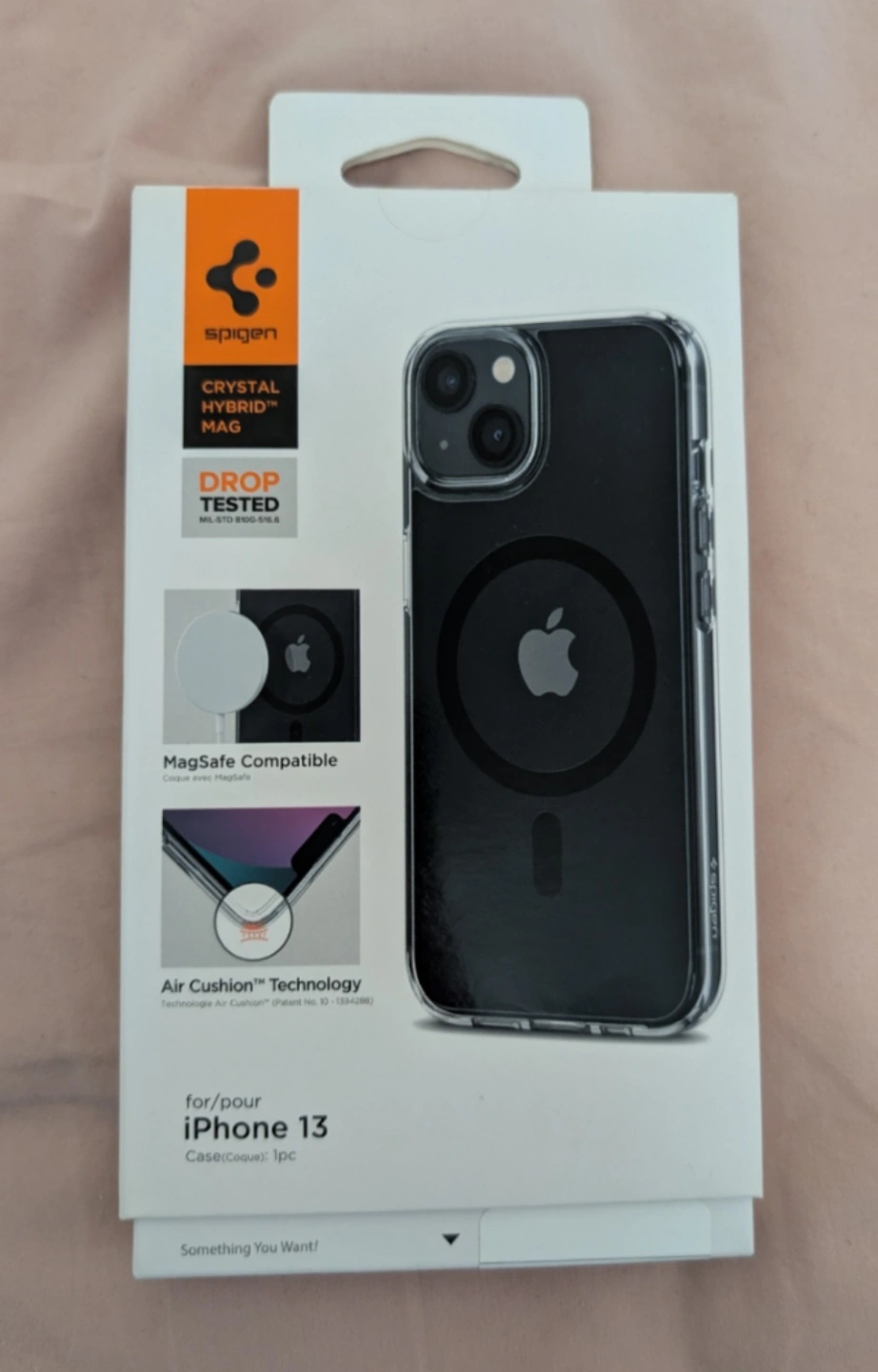 New Spigen Crystal Hybrid Mag phone case. MagSafe compatible. Air Cushion Technology. Clear case with black ring. For iPhone 13. Includes packaging.