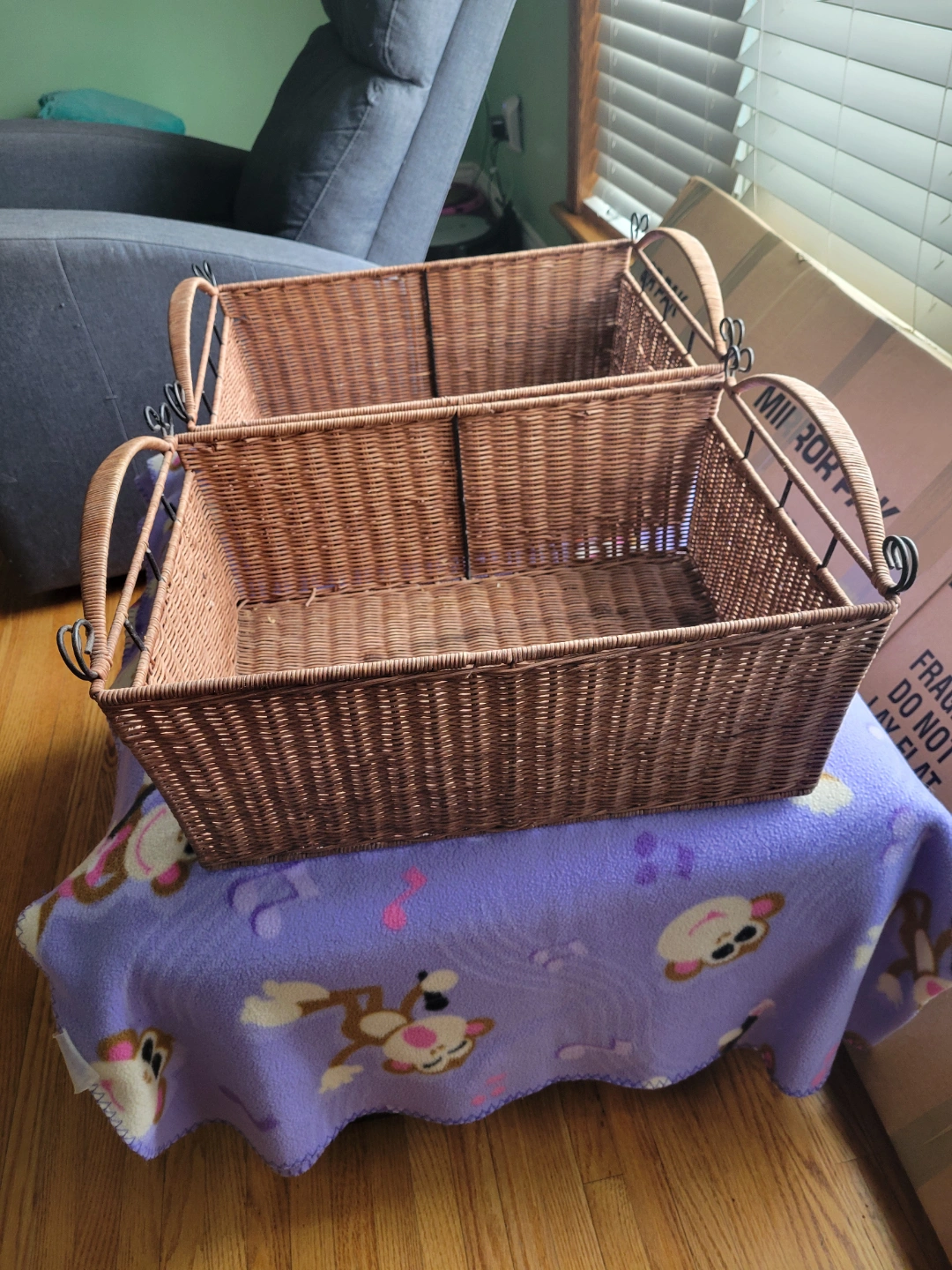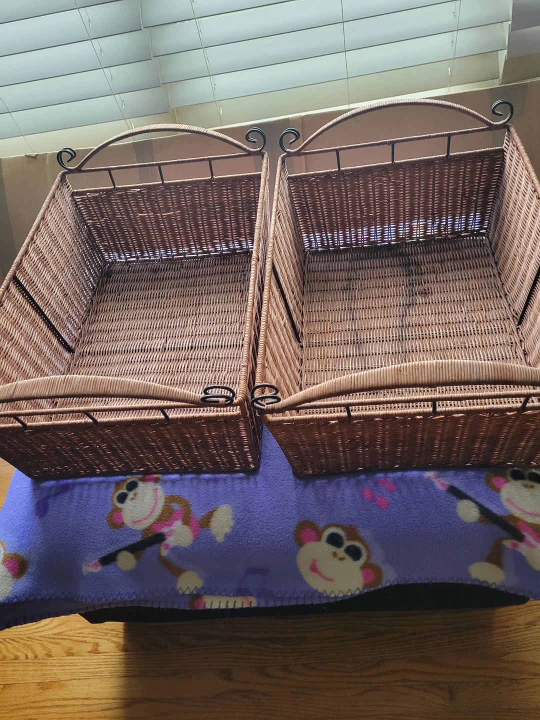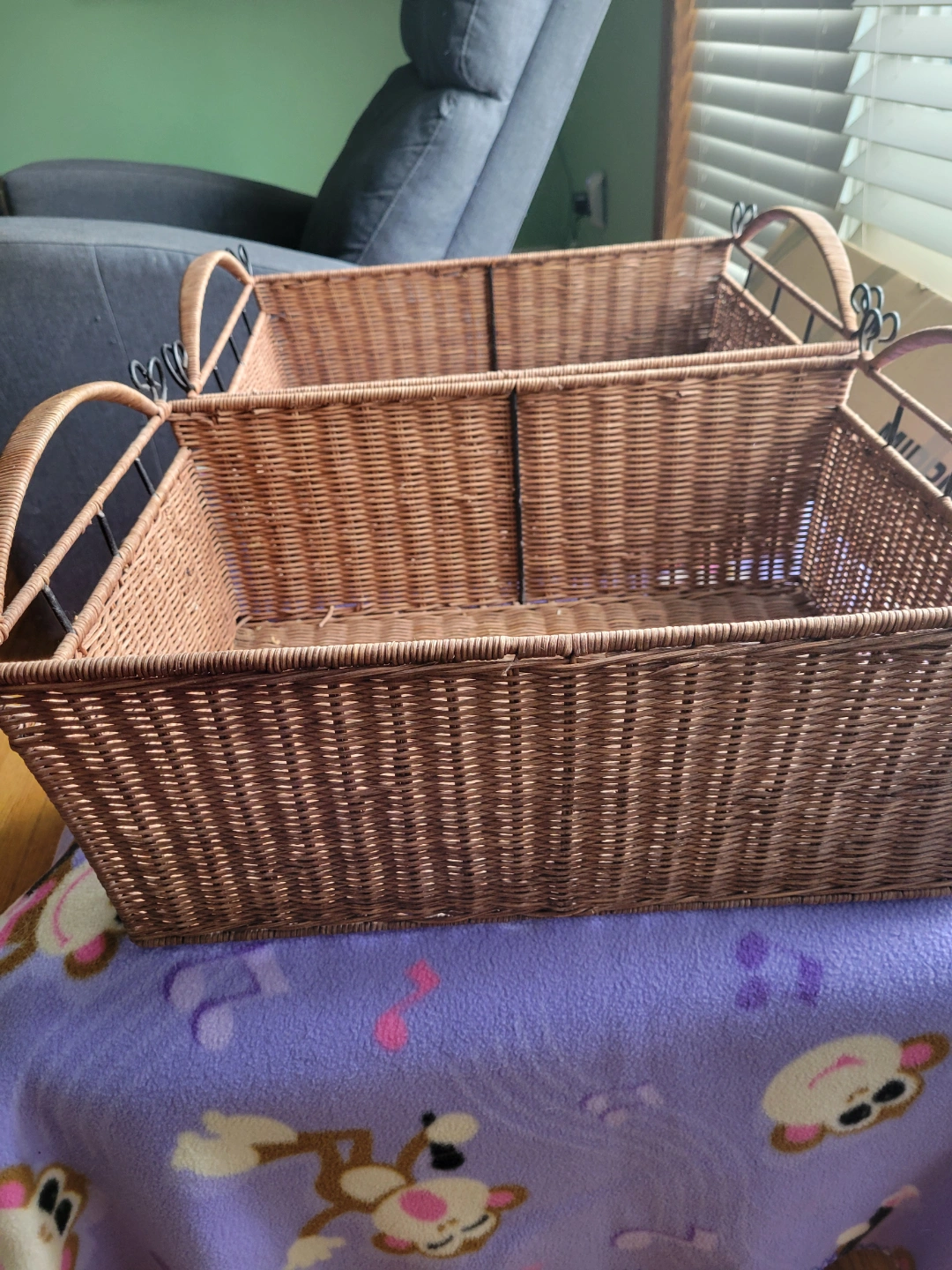 Two rectangular wicker storage baskets. Brown wicker with dark metal accents. Ideal for organizing or storage. Good condition.10.00 for both Pick up Lower Stoney Creek