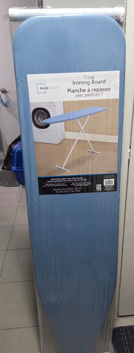 102Adjustable ironing board. Blue padded surface. Safety leg lock. Height adjustable Item is NEW AND SEALED.