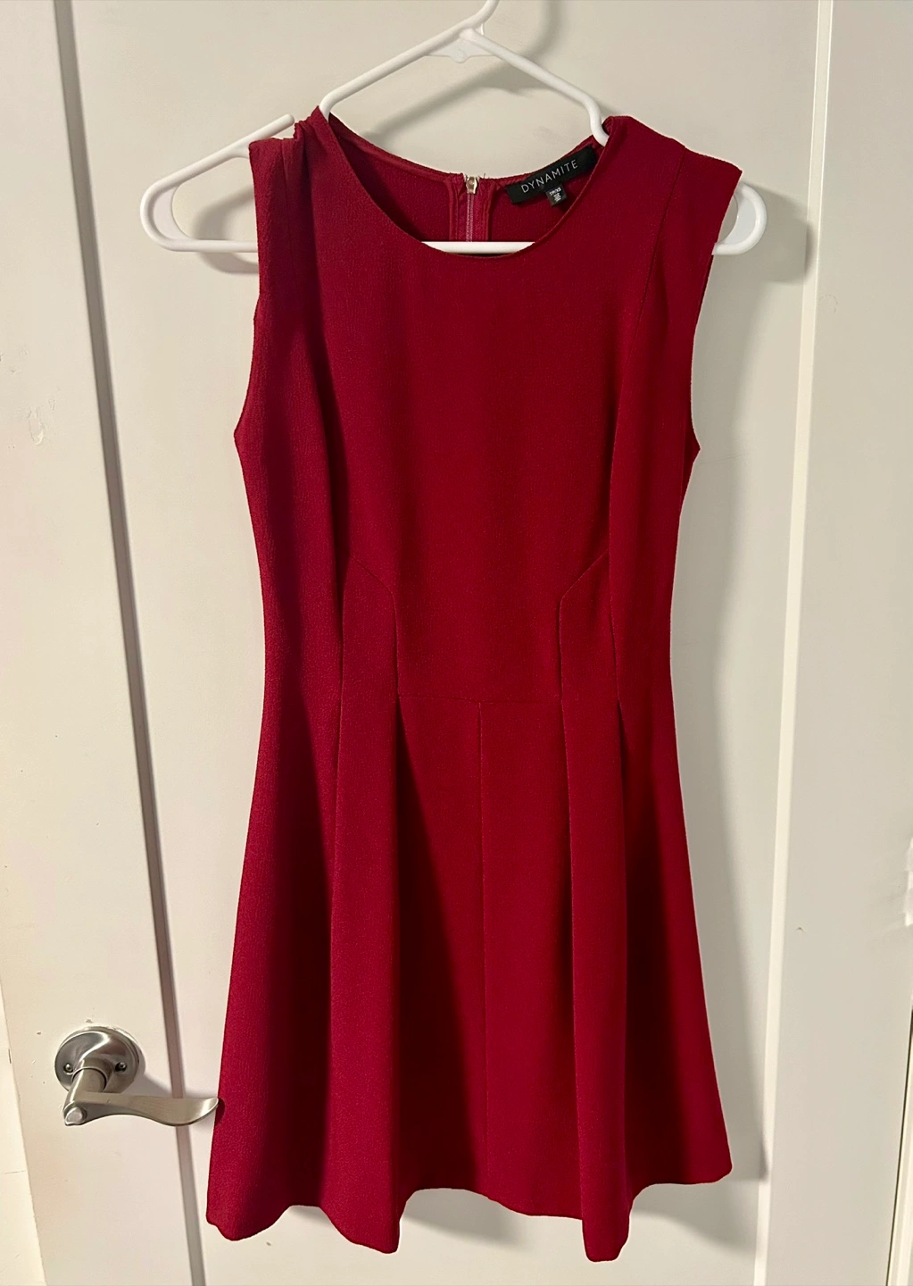 Burgundy dress. Sleeveless. Hidden zipper closure. A-line silhouette. Pleated skirt. Great for a summer wedding or Christmas party.