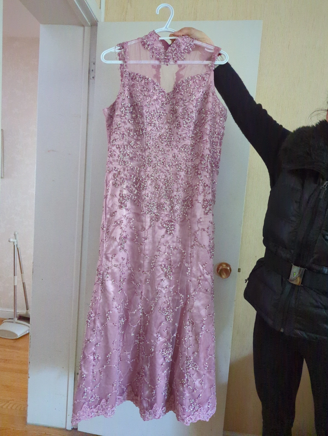 416Stunning floor-length gown. Dusty rose colour. Embellished with delicate beading. Sleeveless, high neck design. Perfect for a special occasion. Gently used, excellent condition.