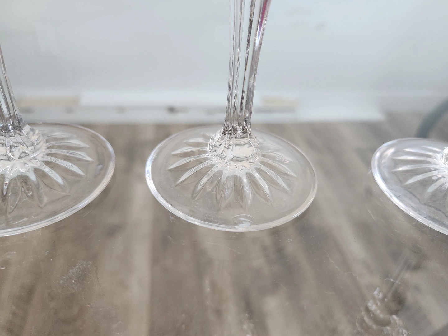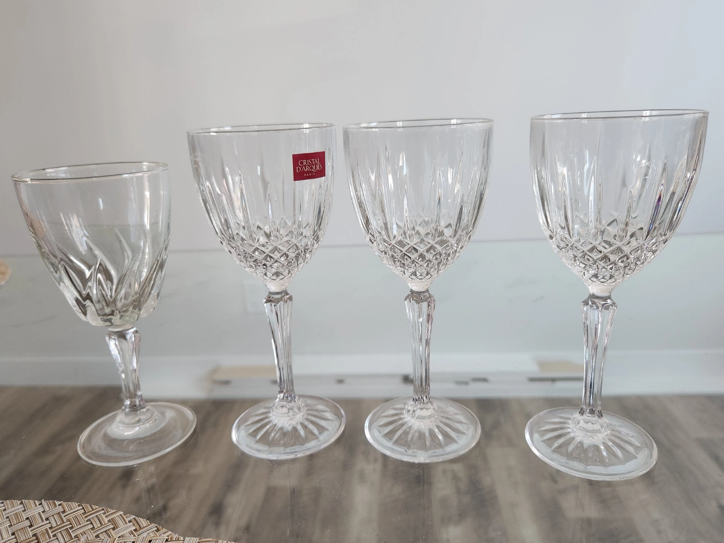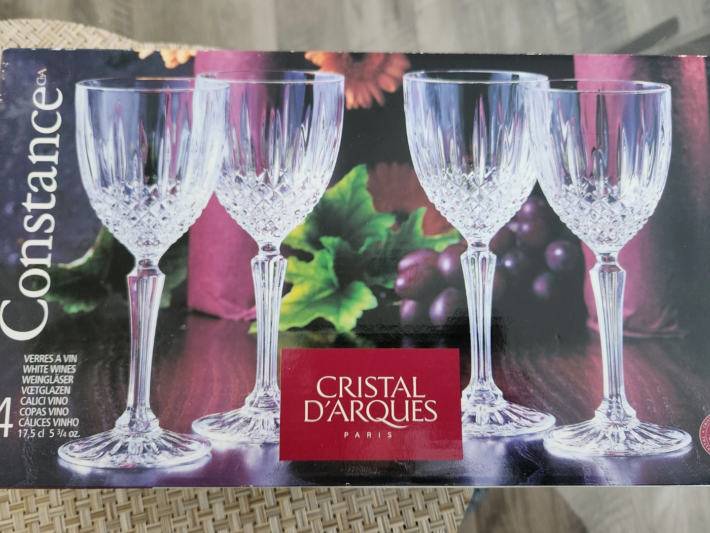 Set of four Cristal d'Arques Constance white wine glasses. One glass has a chip. Elegant design. Crystal glassware.