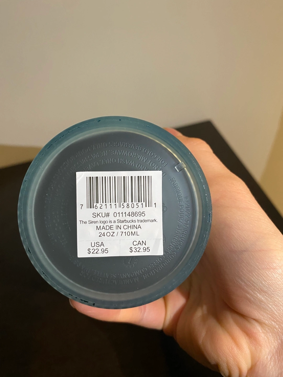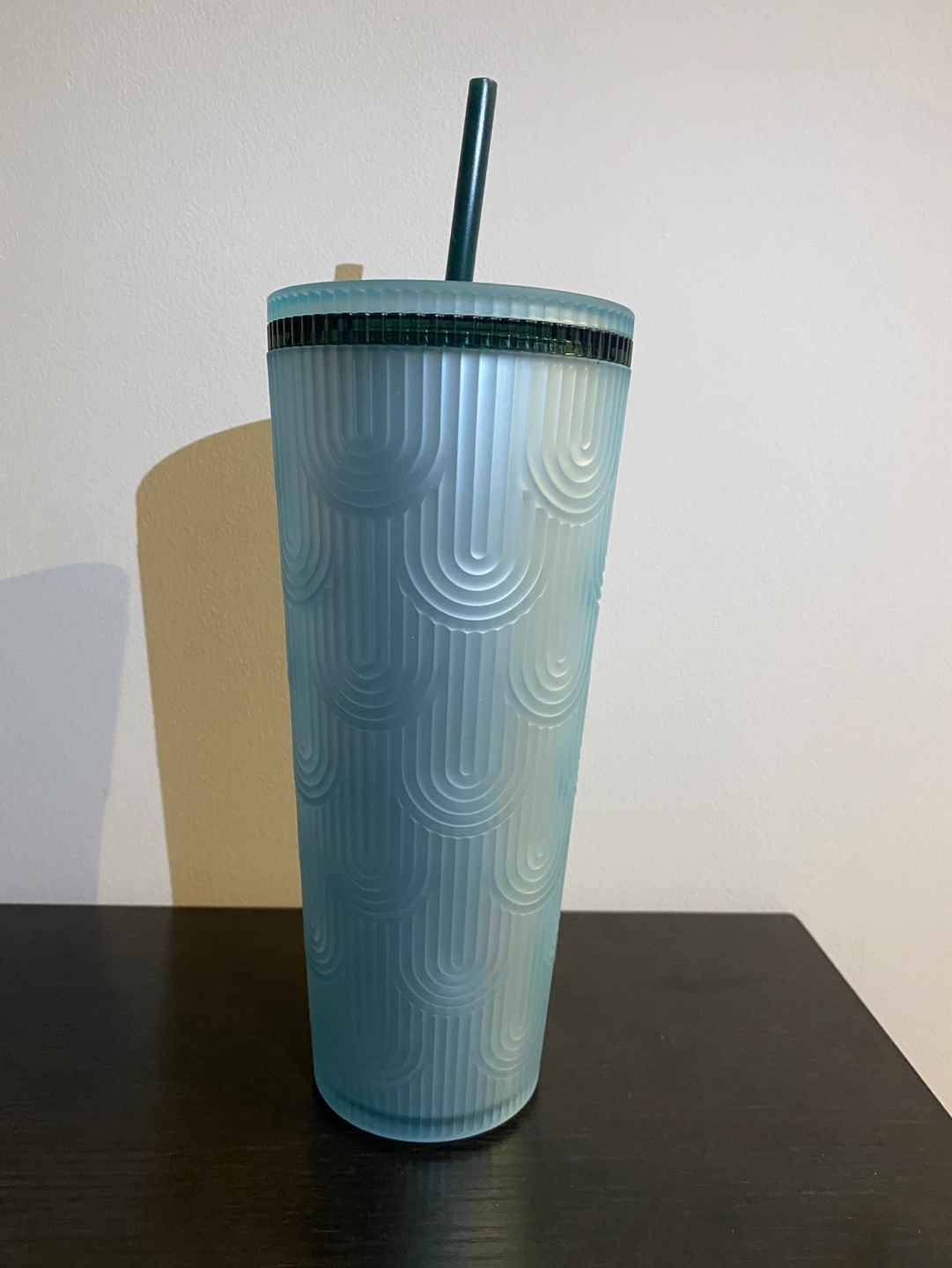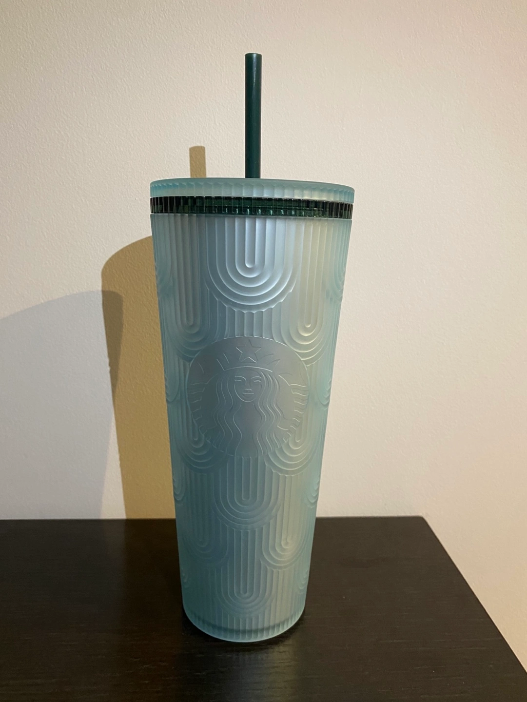 Brand new Starbucks cold cup. Features a teal colour and embossed arch design. Includes a dark green straw. 24 oz capacity.