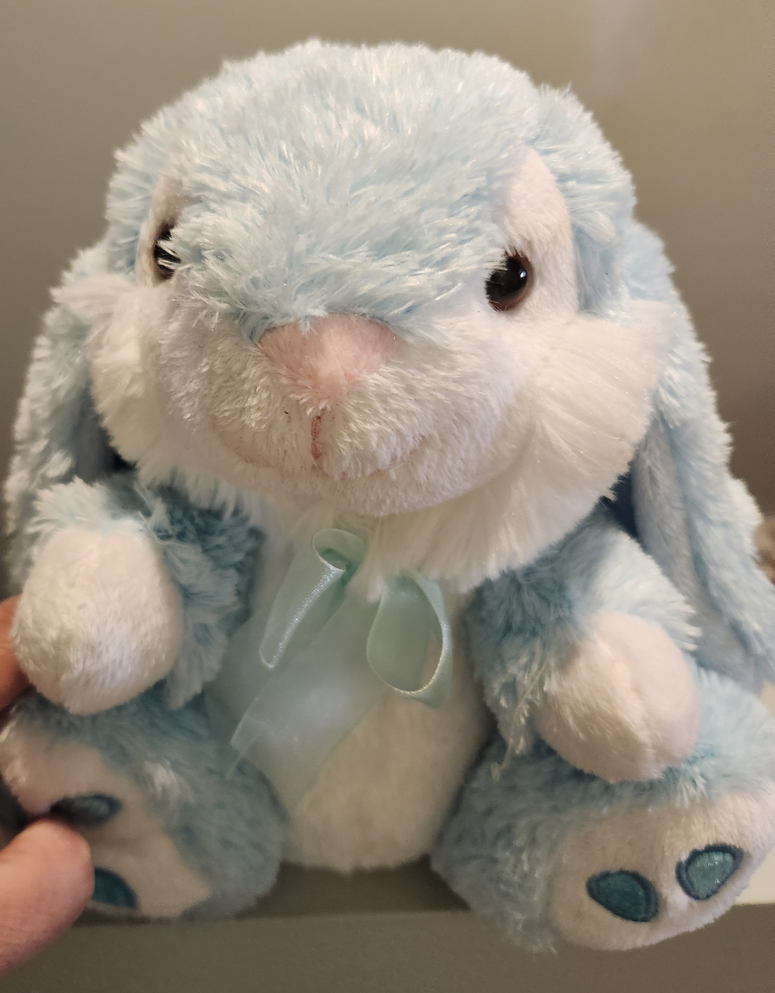 Soft blue bunny plush toy. Features long ears and a pale blue ribbon. Small and cuddly. Perfect for a baby's room.