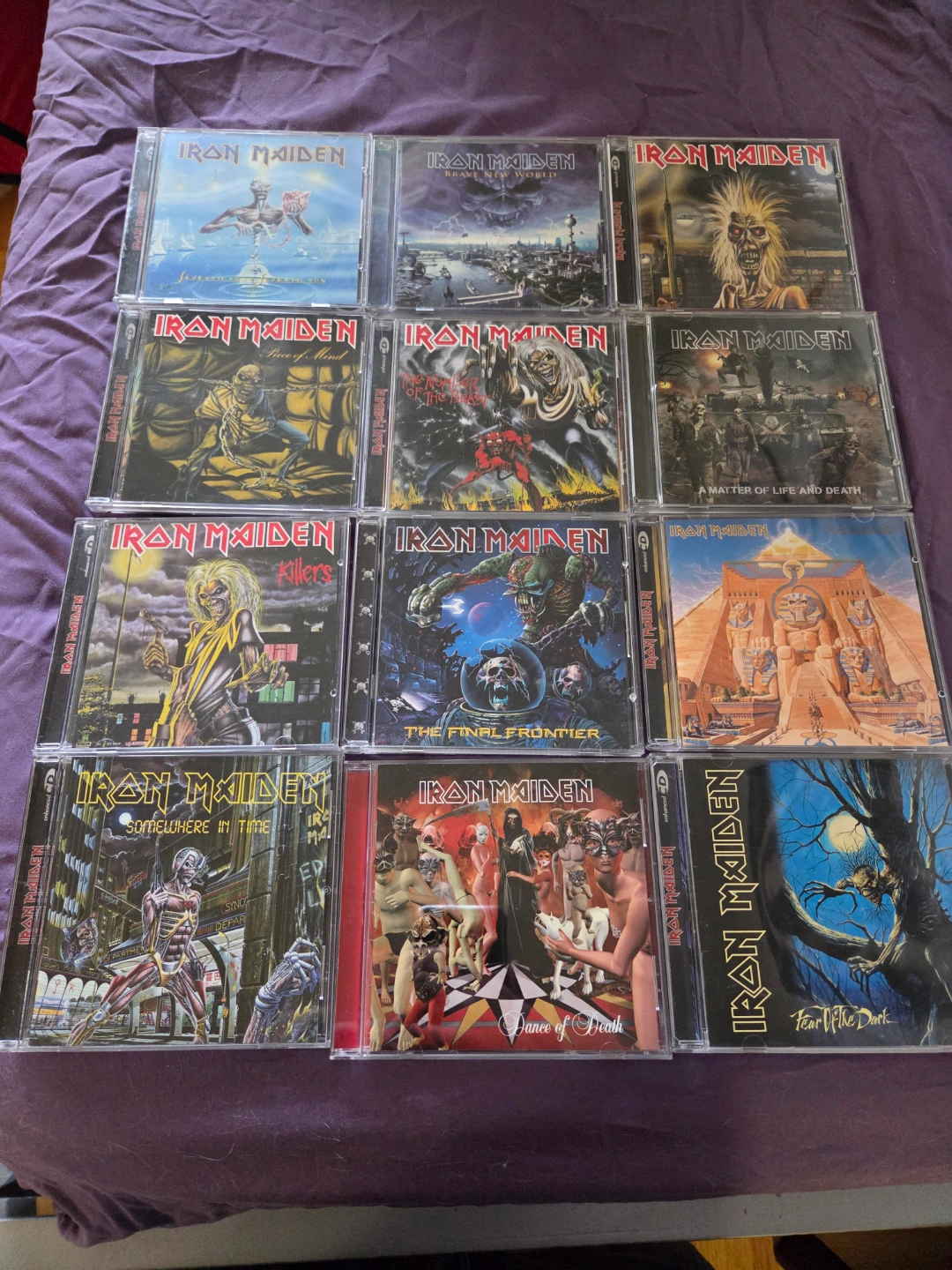 Collection of ten Iron Maiden CDs. Albums include: Seventh Son of a Seventh Son, Brave New World, Fear of the Dark, A Matter of Life and Death, The Number of the Beast, Killers, The Final Frontier, Somewhere in Time, Dance of Death, and Piece of Mind. Jewel cases included.