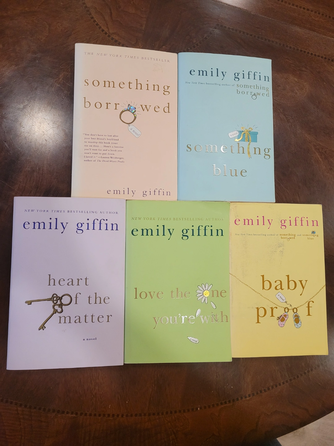Set of five Emily Giffin novels. Includes Something Borrowed, Something Blue, Heart of the Matter, Love the One You're With, and Baby Proof. Used, good condition.