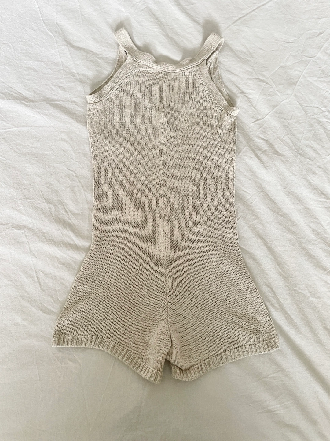 Beige coloured knitted romper. Features a V-neck, button closure!