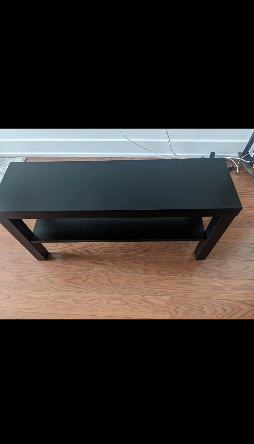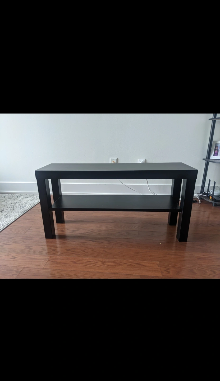 Simple black console table. Features a single lower shelf. Great for entryway or living room. Minimalist design.