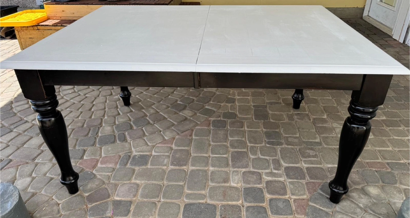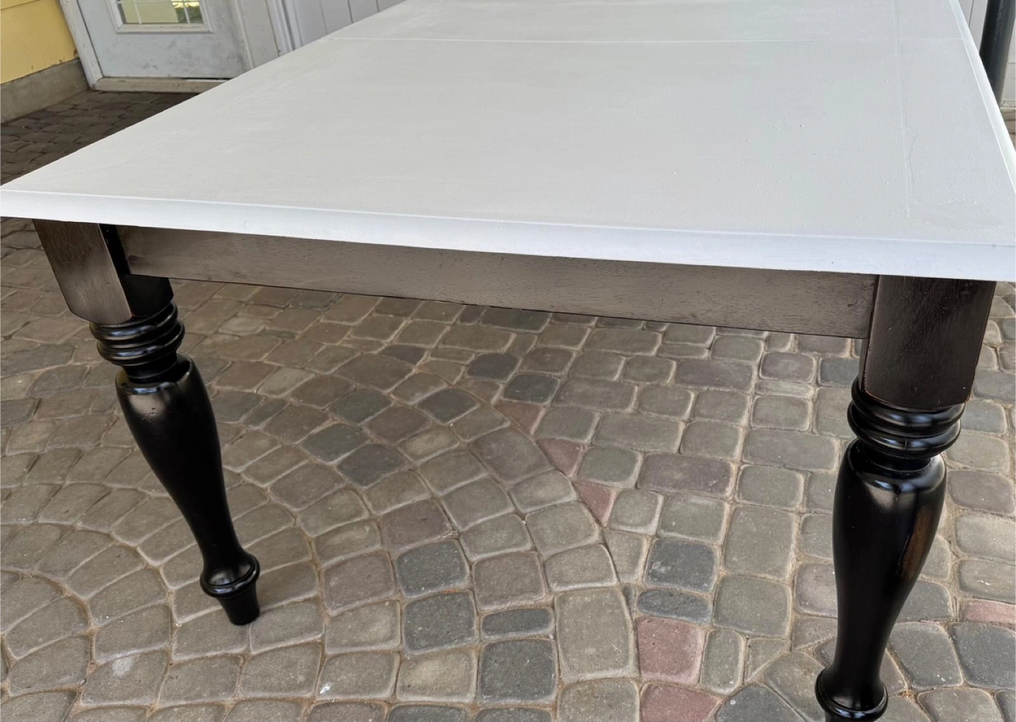 Large rectangular table. Dark stained legs. White painted top. Two leaves. Perfect for a kitchen or dining room.