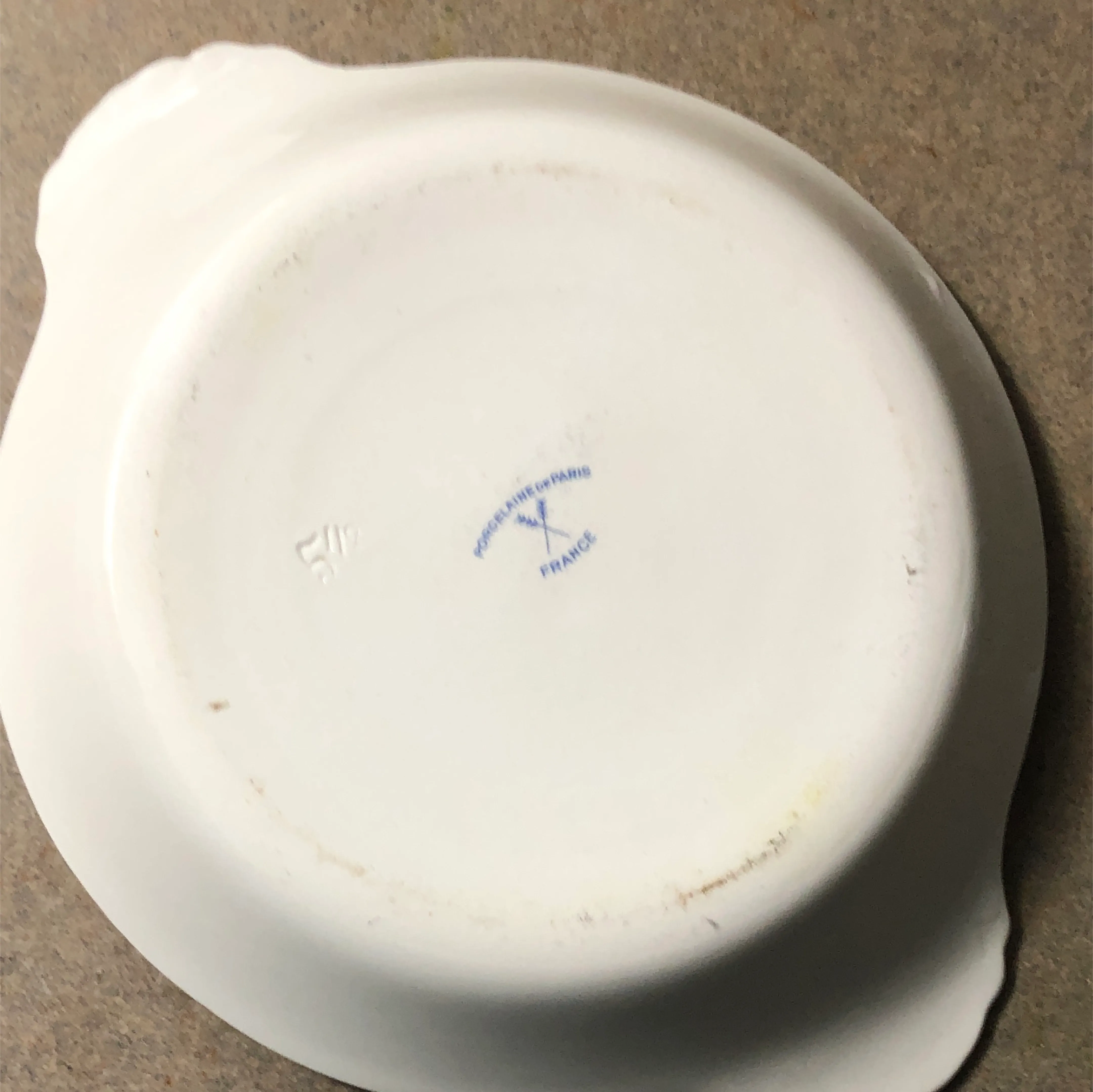 Small porcelain serving dish. Features an ivy leaf design. Two handles. Made in France.