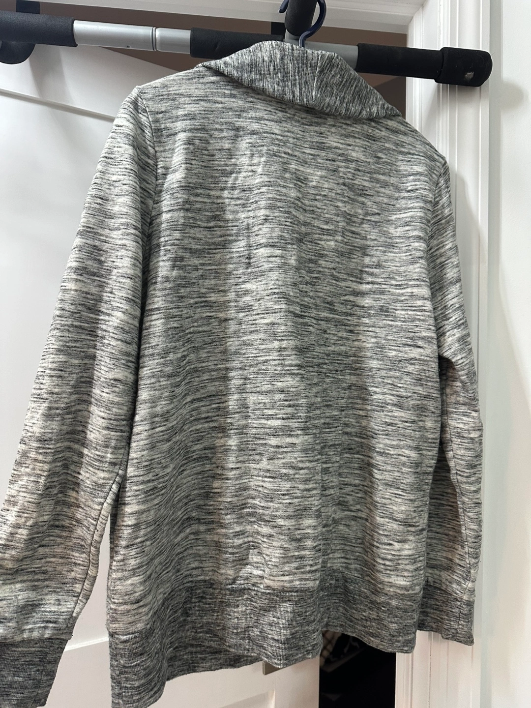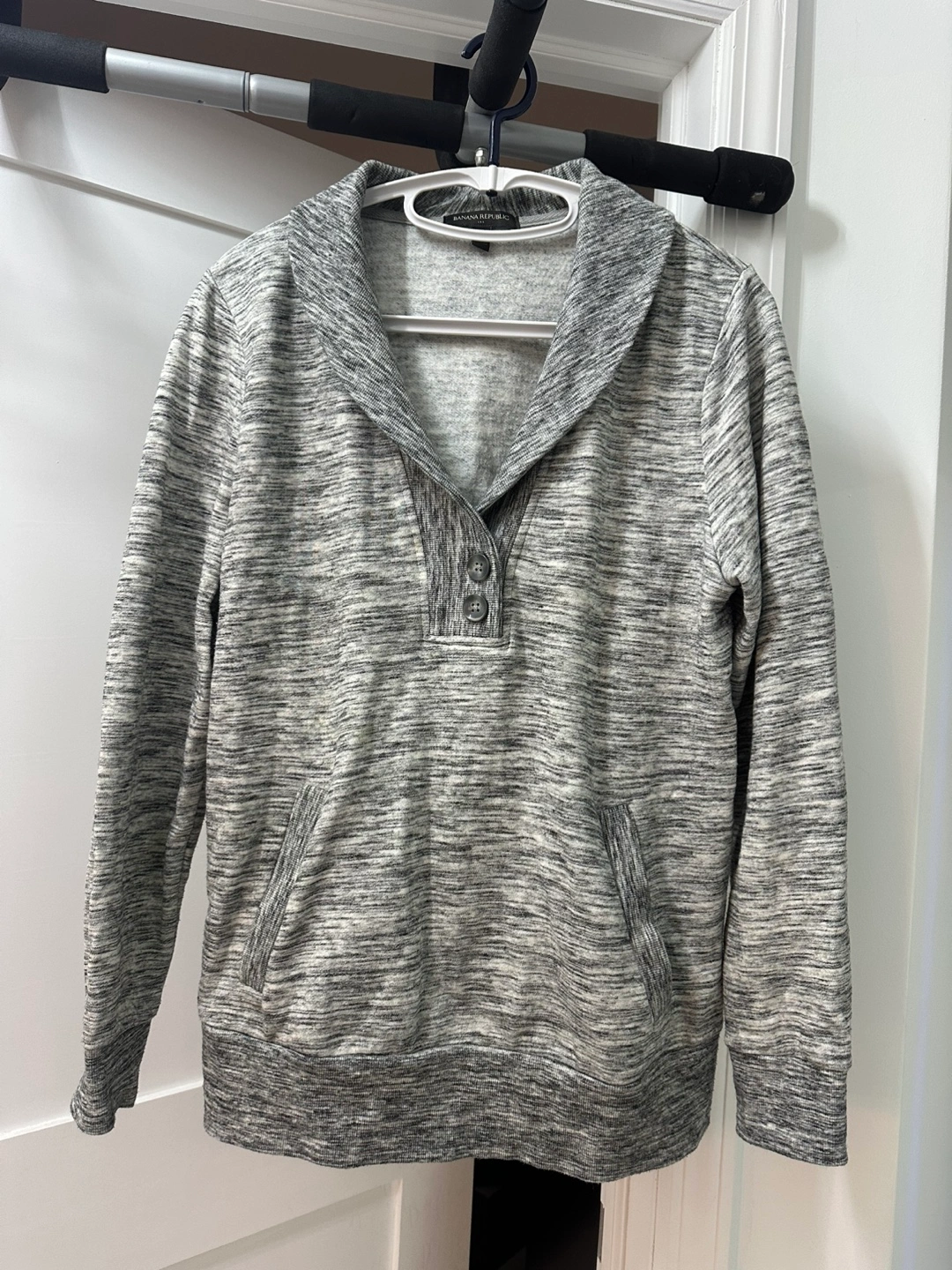 Women's size large long sleeve sweater. Gray heathered knit. Collared neckline with button closure. Kangaroo pocket. Soft material. Clean up my closet.