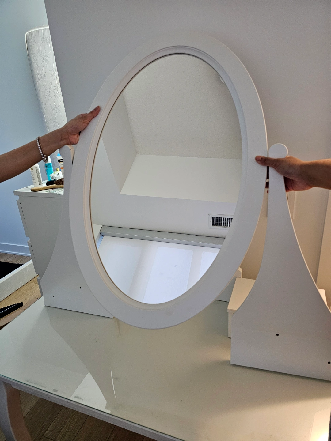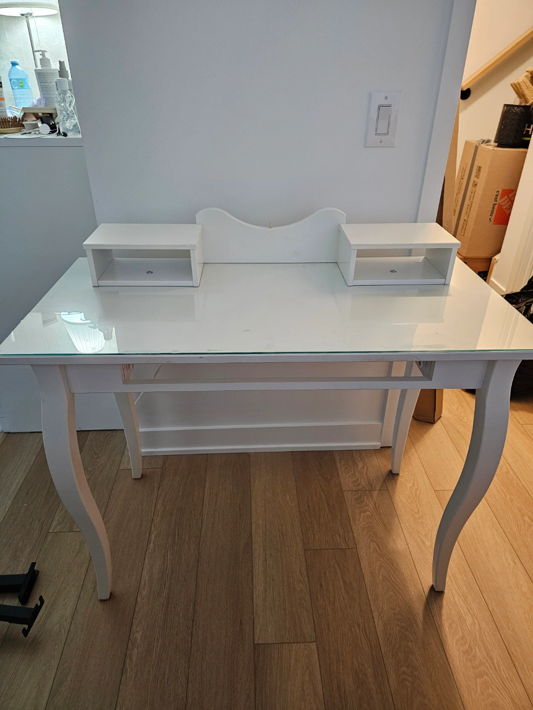 White dressing table with oval mirror. Two small drawers on top and one long drawer underneath the table. Has a glass top with some minor cosmetic wear. Open to offers. Pick up downtown Toronto and cash only. Comes disassembled so easy to transport.