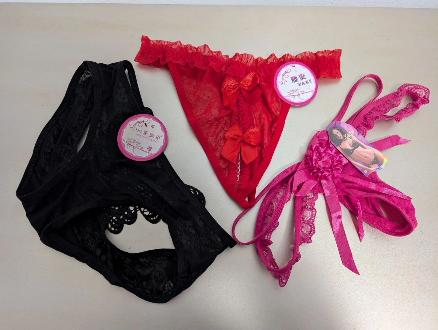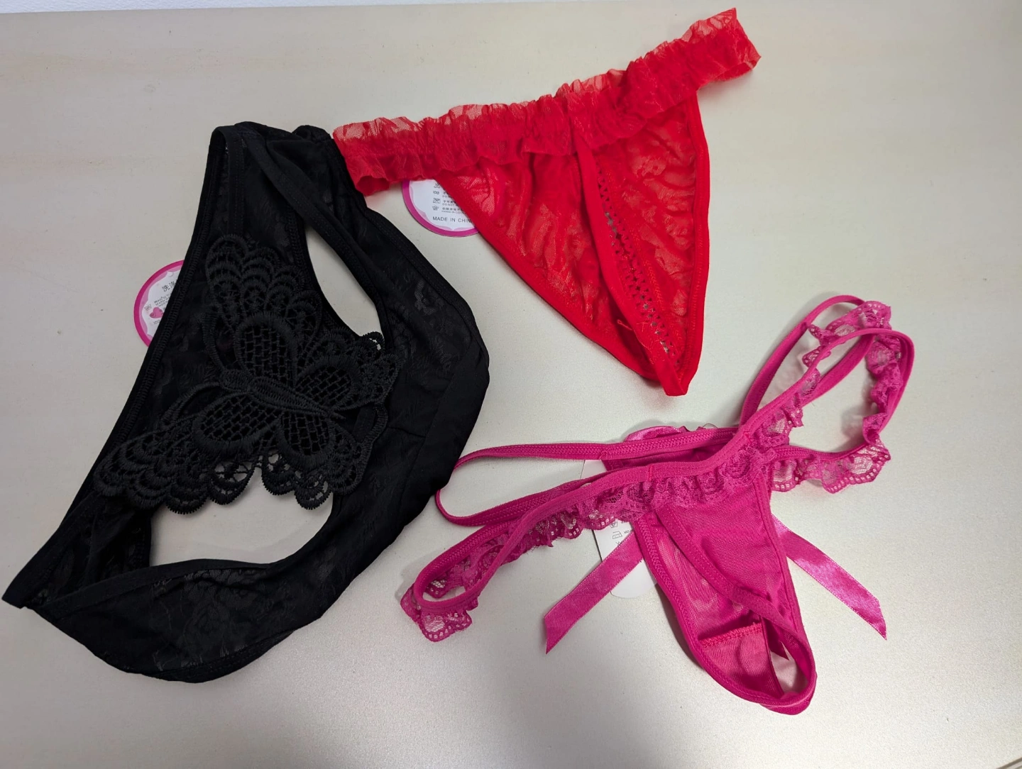 301Three new thongs. Red, black and pink. Lace detailing. Bow accents. One size.