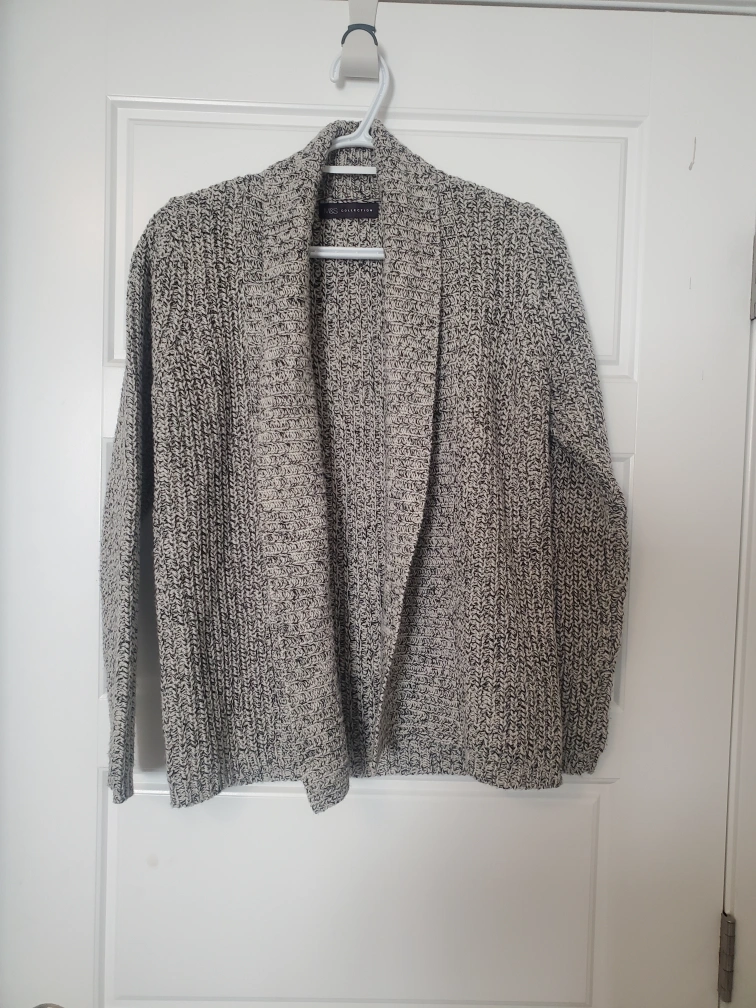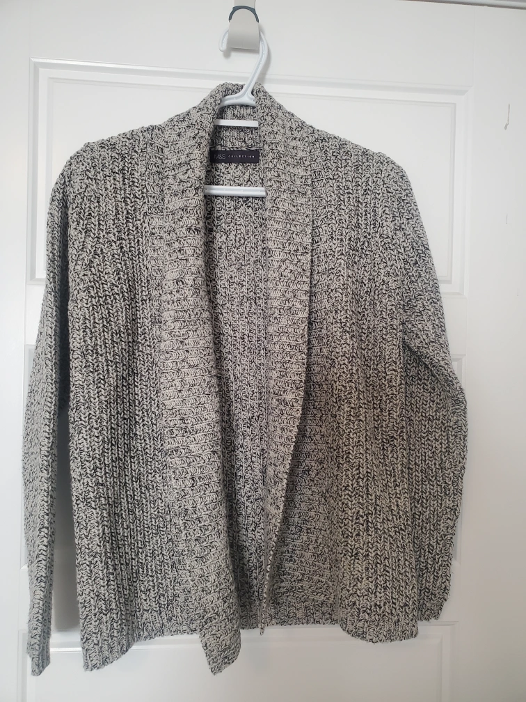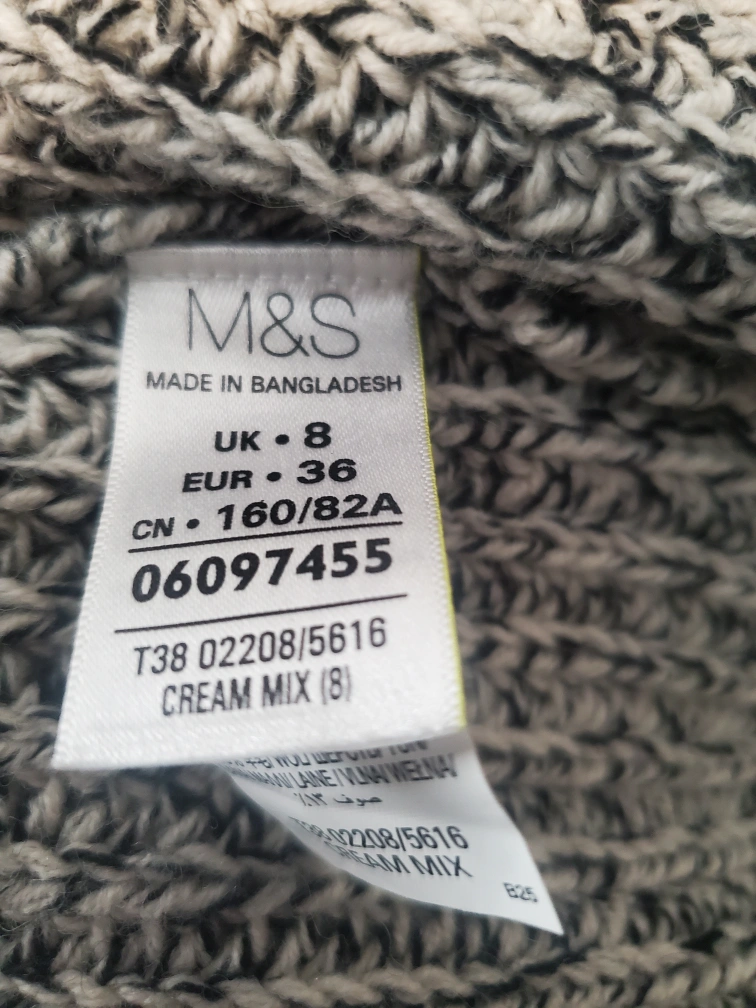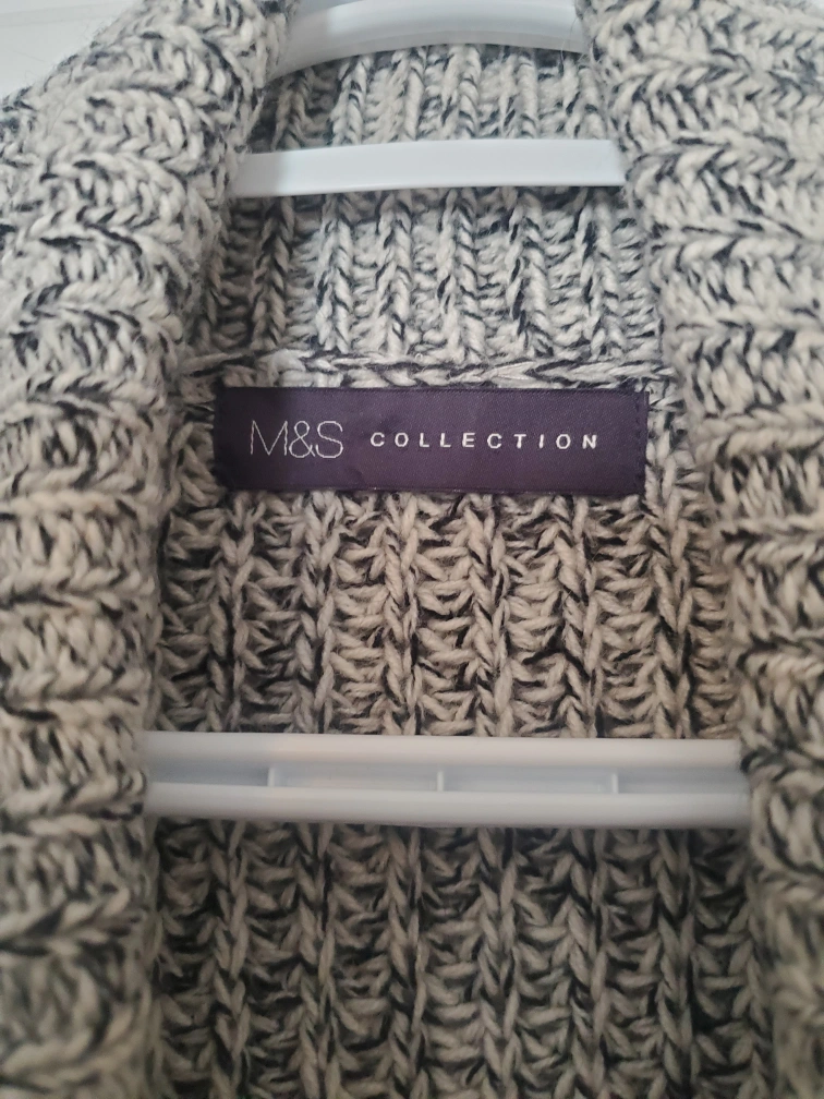 Cream and black speckled knit cardigan. Open front. Long sleeves. Size UK 8. Like new. Brooch came separately but can sell together if the price is right.