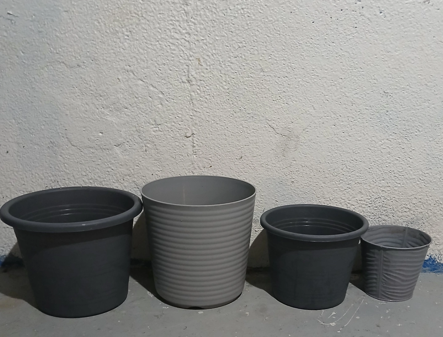 Four plastic pots, varying sizes and colours. Two dark grey and two light grey. Good for indoor or outdoor plants.