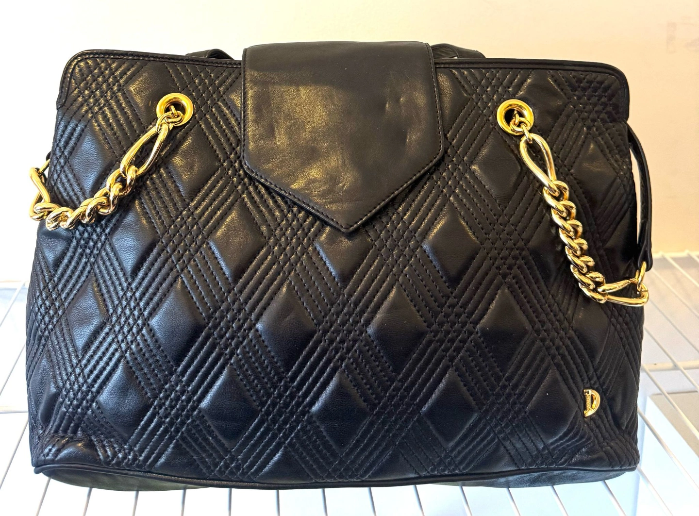 60Beautiful vintage handbag. Black quilted leather. Features a gold chain strap and flap closure. Stylish and elegant.