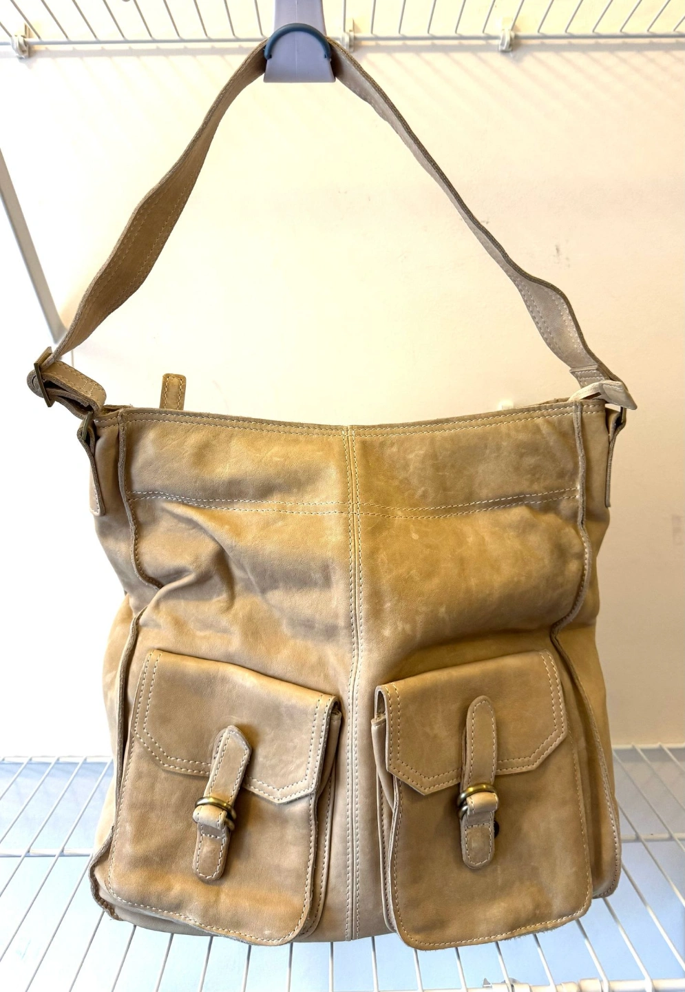 60Large tan leather shoulder bag. Features multiple pockets and a spacious main compartment. Perfect for everyday use.