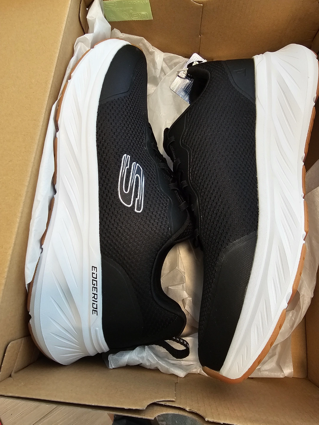Pair of black Skechers running shoes. White soles and accents. EdgeStride technology. New in box.