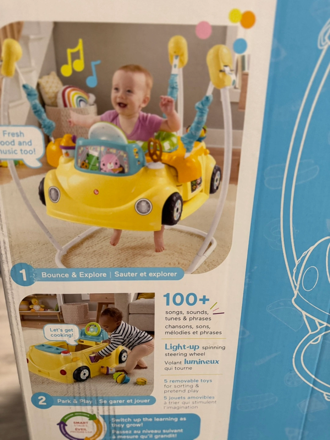 Features two modes: bounce and explore, park and play. Includes lights, sounds, and spinning steering wheel. Suitable for babies who can sit unsupported.
