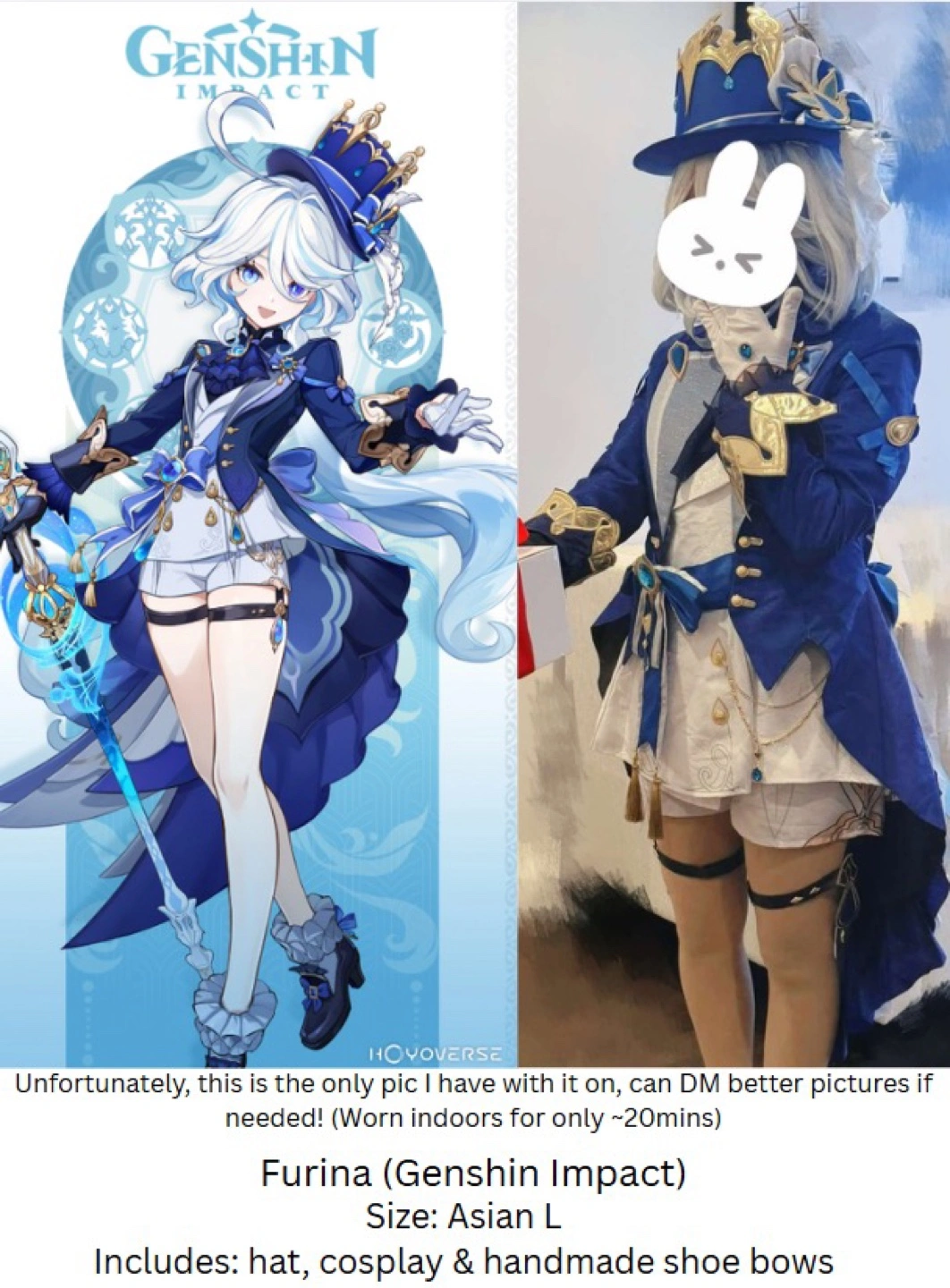 Genshin Impact Furina cosplay. Includes hat, cosplay outfit, and handmade shoe bows. Worn indoors for only 20 minutes. (Second owner)