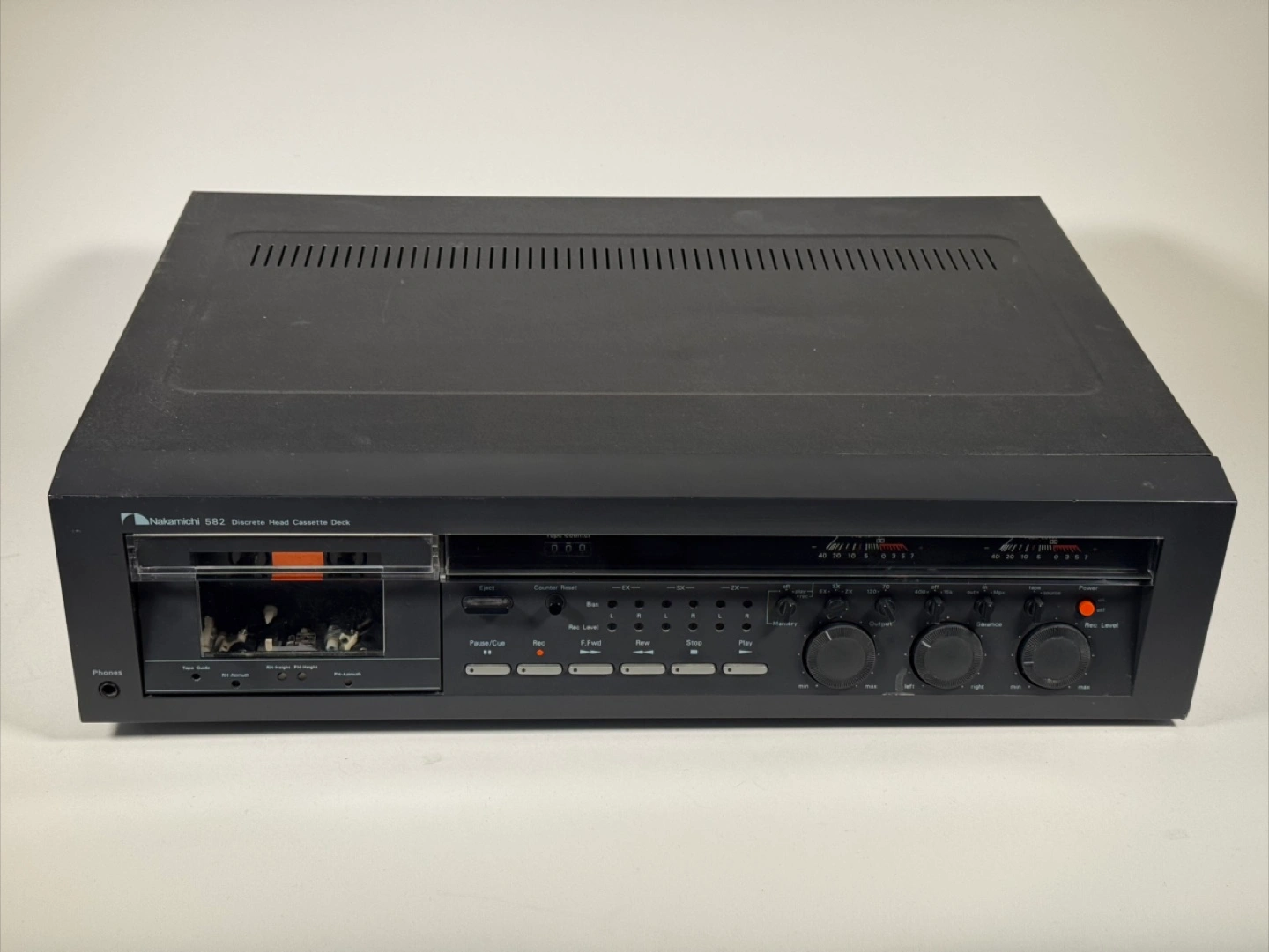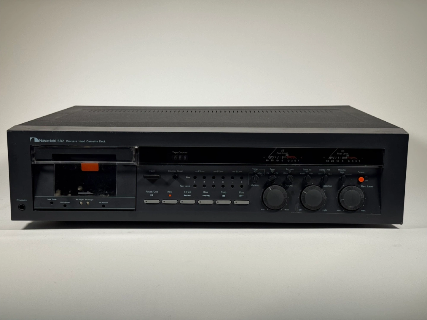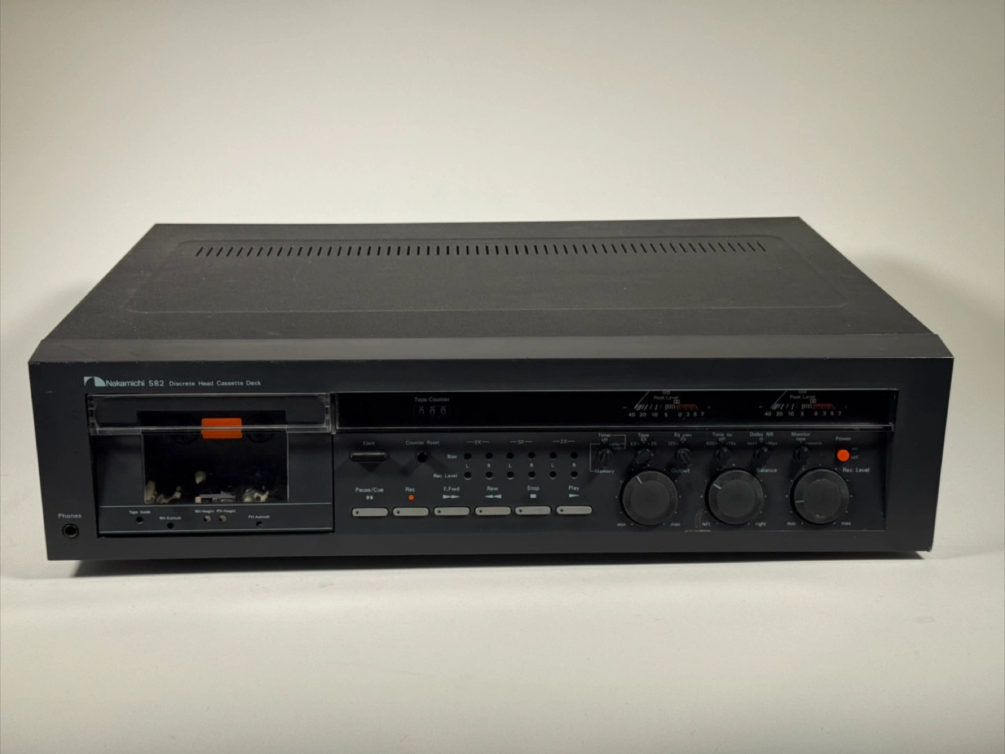 Vintage Nakamichi 582 stereo cassette deck. Dual capstan drive. Features include Dolby B and C noise reduction, peak level meters, and various playback/recording controls. Excellent sound quality.