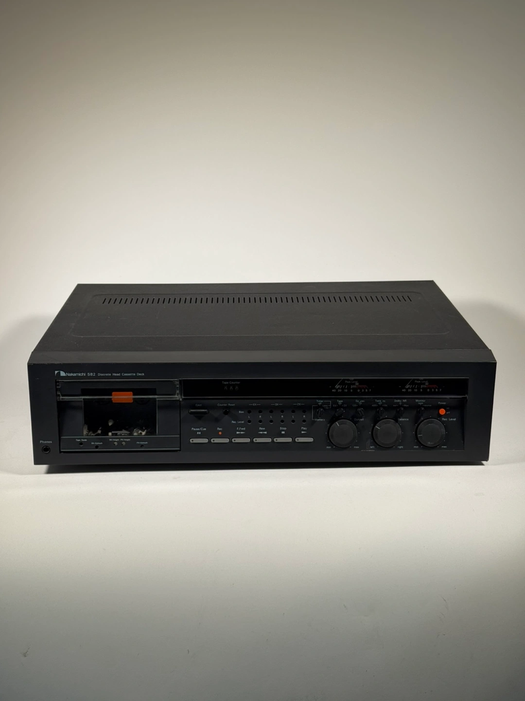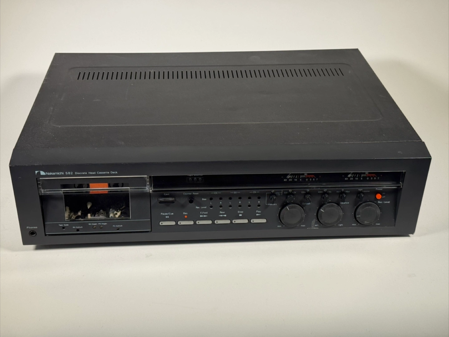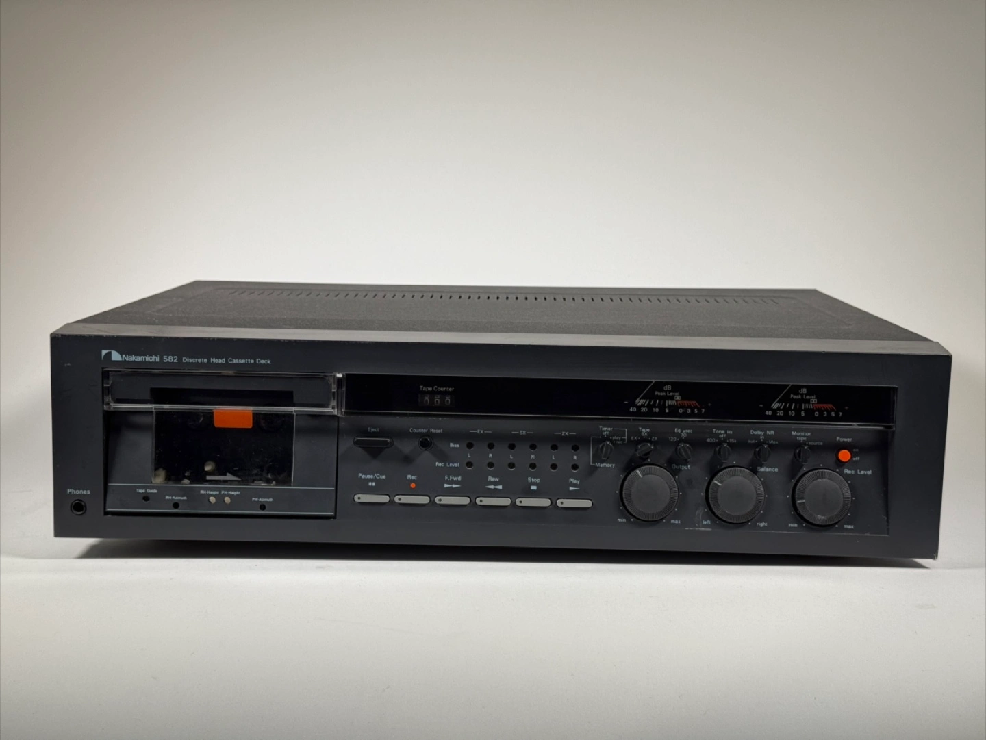 Vintage Nakamichi 582 stereo cassette deck. Dual capstan drive. Features include Dolby B and C noise reduction, peak level meters, and various playback/recording controls. Excellent sound quality.
