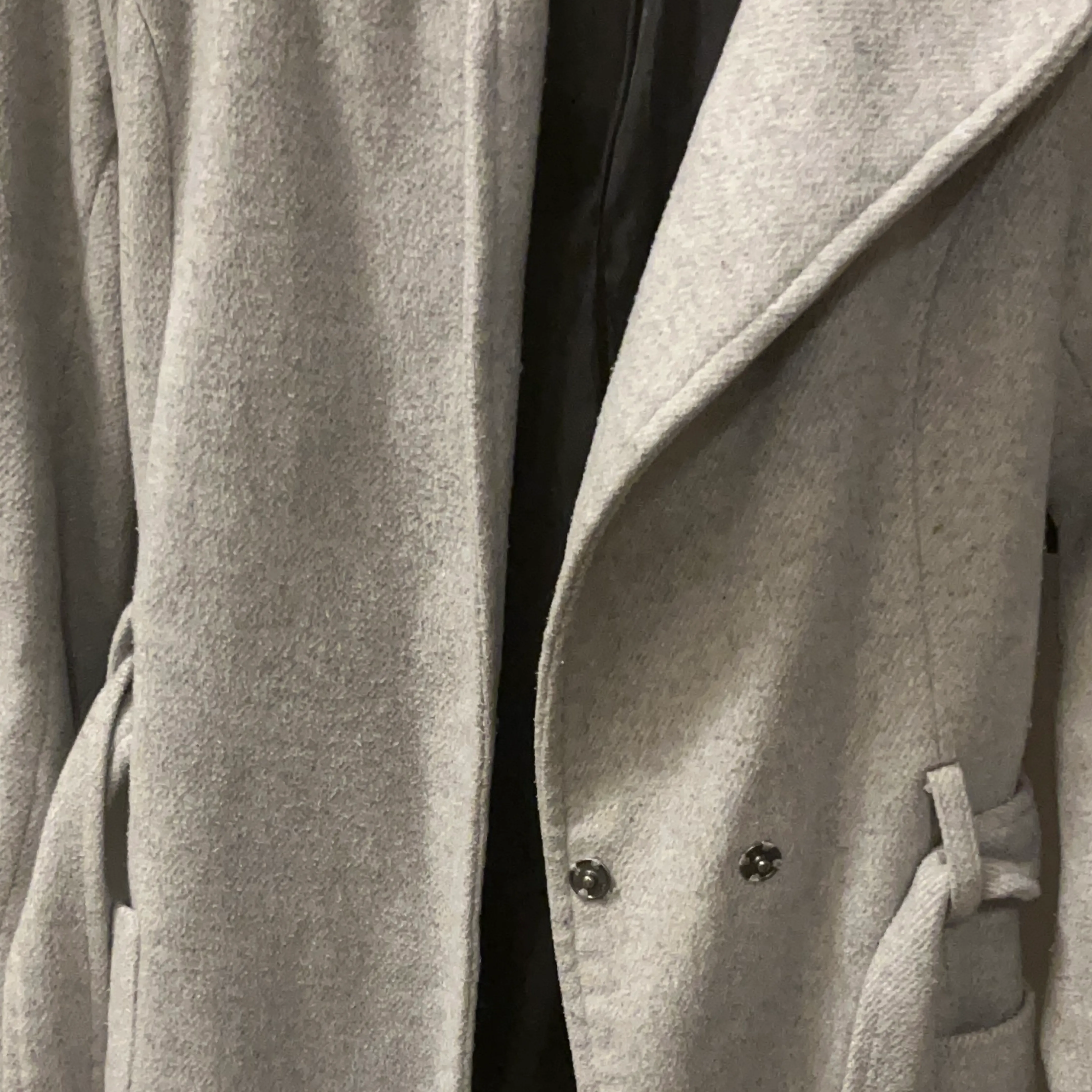 Long grey overcoat. Features a notched collar, button closure, and self-belt. Fabric appears to be wool-blend.