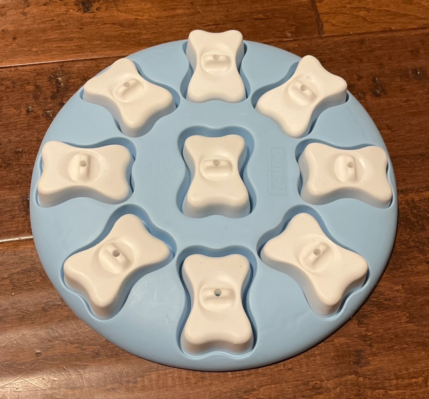 Fun puzzle toy for dogs. Keeps dogs entertained. Eight treat hiding spots. Blue base, white bone pieces.