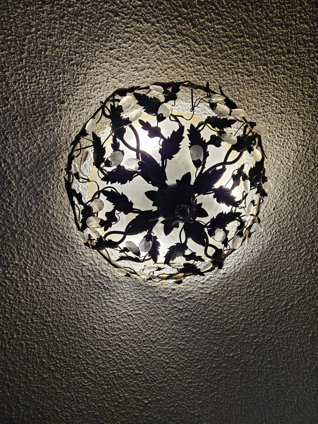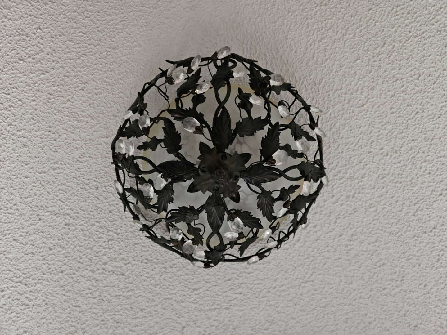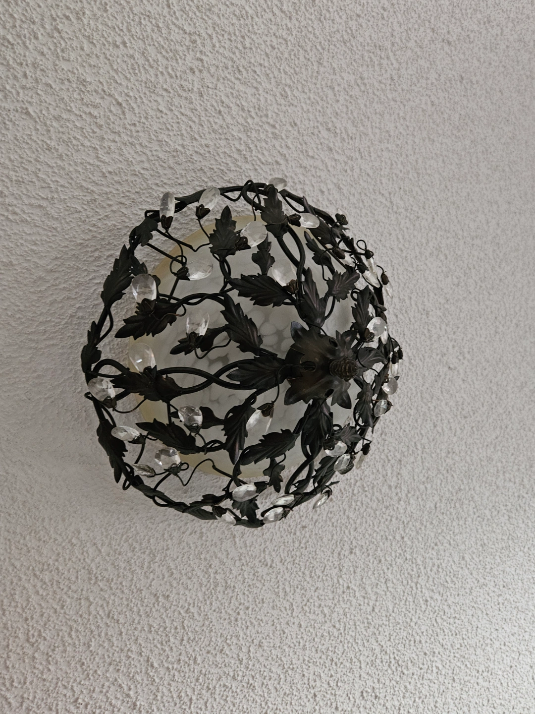 Beautiful ceiling fixture. Features a black metal frame with leaf and crystal accents. Includes a frosted glass shade. Adds a touch of elegance to any room.