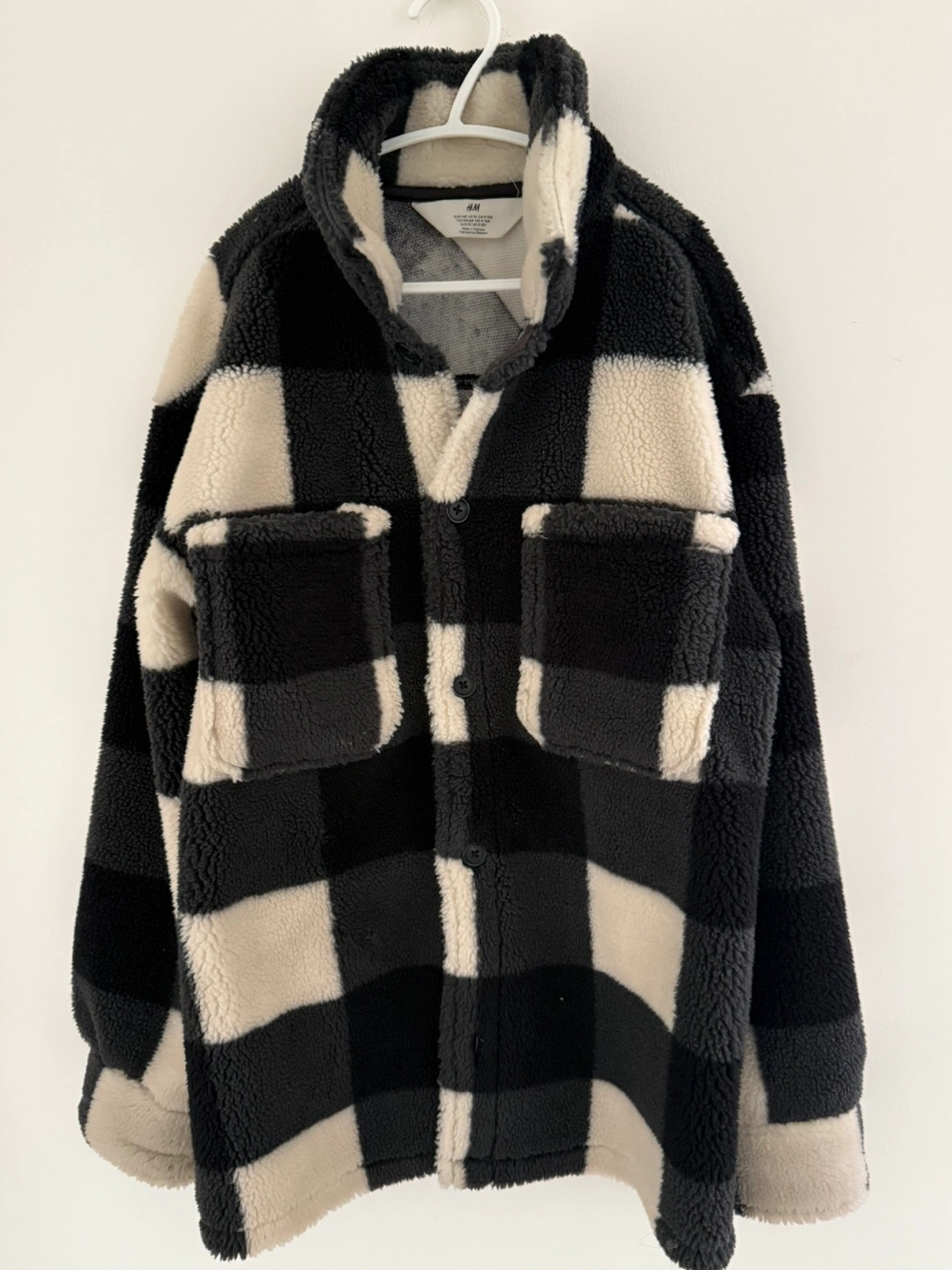 Cozy fleece jacket. Black and white buffalo check pattern. Button closure. Size 140 (check measurements). Soft and warm.