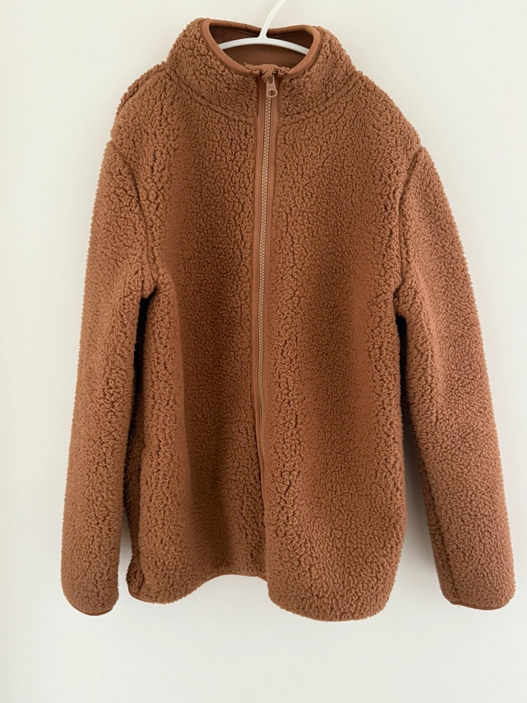 Warm brown fleece jacket. Full zip closure. Long sleeves. Cozy and comfortable. Perfect for fall or winter.