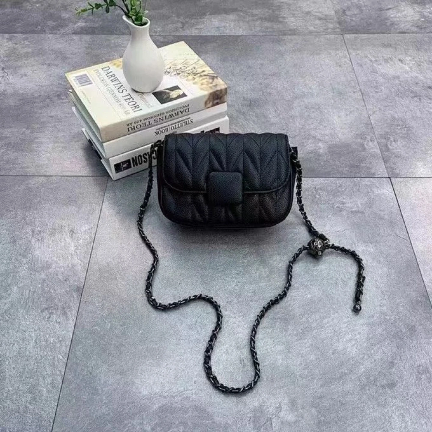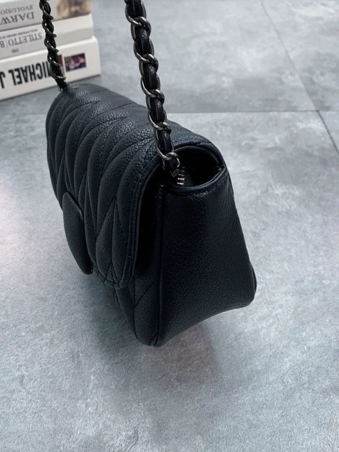 (New) Small black shoulder bag. Features a quilted design and a chain strap. Metal detail on the strap. Flap closure.