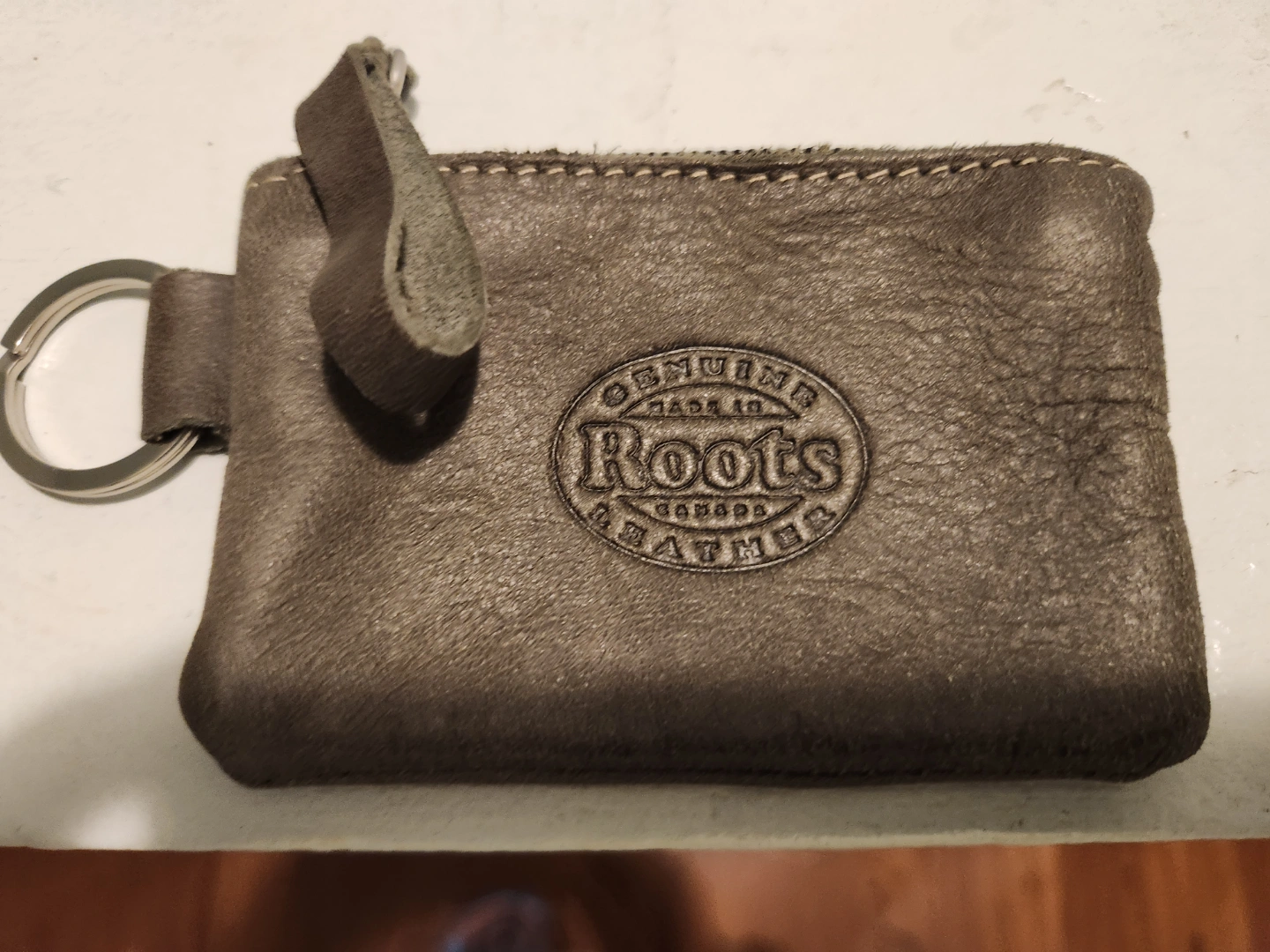 Genuine leather keychain wallet. Small, army green, zipper closure. Features a metal keyring. Never use.